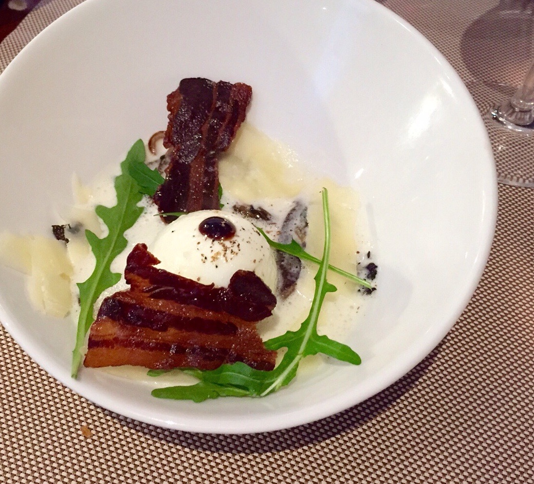 We started with a black (blood) sausage/blood pudding amuse bouche. Boudin noir, or black pudding made black from blood – yes, really – is fairly pervasive in French and British cuisine. Now, I’ve always been afraid of any dish with ‘blood’ in the name, but when something is offered to me, it would be rude to refuse. So I finally tried my first blood pudding. Though I couldn’t quite move my mind away from the concept of what I was eating, the flavor was really exquisite, I’ll admit. With the texture of seared foie gras though less compact and a flavor that evoked pate, truffles, and a hint of sweetness and iron, it was complemented by onions that had been pickled and just barely caramelized.