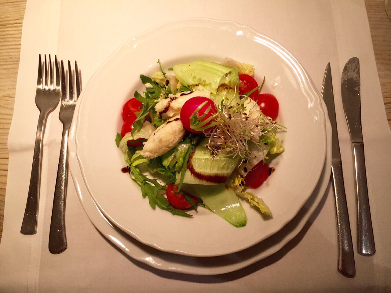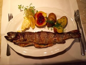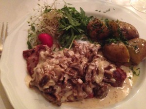 Our first, cold starter was a salad of mixed lettuces with tangy ewe’s cheese (sheep’s cheese), shaved cucumber, sprouts, and tomatoes. The starters were served alongside a basket of nutty, whole grain bred and sourdough loaf accompanied by the house special lard, in lieu of butter. The lard had bits of meat incorporated in for a chunky spread; Riga, Latvia’s Valtera restaurant had a far superior, smooth and smoky lard in my opinion. We each ordered a glass of a Polish white wine, which was sweeter than expected – somewhat like a semi-sweet Riesling but worked well with the salty cheese in the starter. Sidebar: The more I travel, the more I appreciate the quality and diversity of European wines, particularly in comparison to American wines; eastern European wines, while less exported and revered as their French, Italian, and Spanish brothers, are both interesting and reliably good.