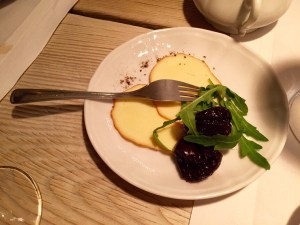 Dessert proved to be the best course. What was billed as an apple cake actually turned out to be a tart apple pie with a vodka or whiskey sauce, vanilla ice cream, and whipped cream. It had the mildest sweetness, which drew attention to the tart, slightly spiced apple filling. It was fabulous, and I ate every bite of the large portion. The finishing course was sliced, smoked cheese (listed as ewe’s cheese on the menu, it tasted much more like cow’s Gouda) with a stewed plum, said to aid digestion. The sweet and savory combination was a nice finish to the meal.