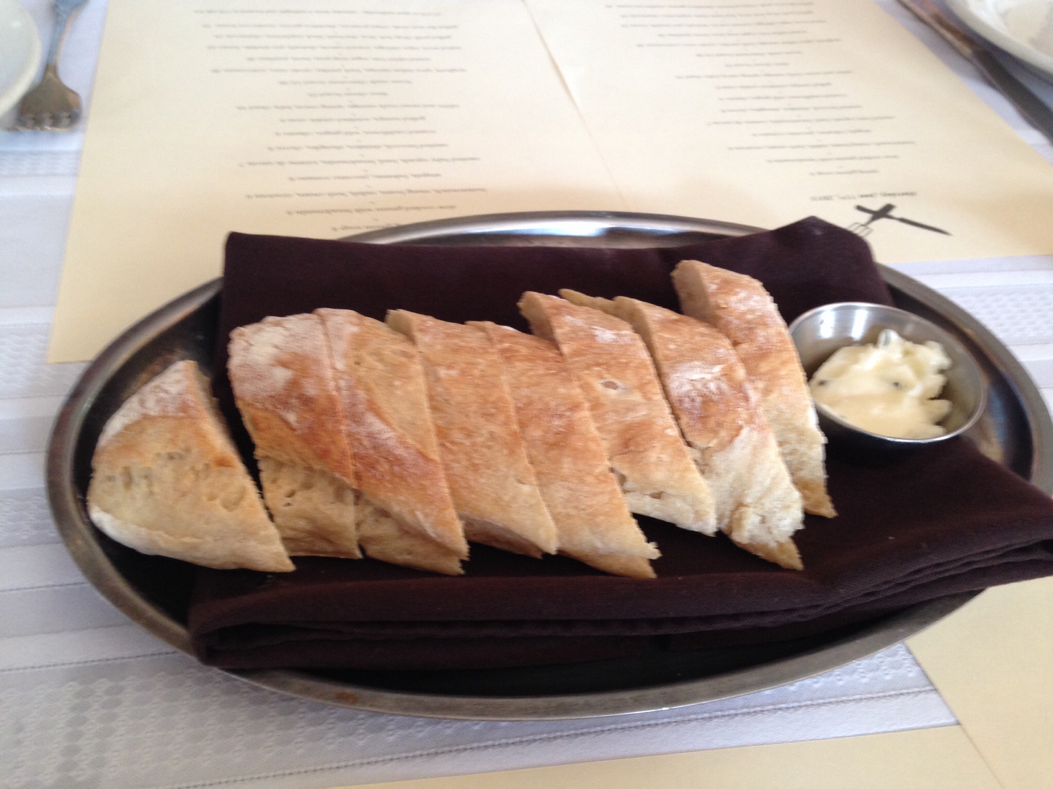The menu changes daily, depending upon seasonality and availability, so I can only help you, the prospective traveler, but so much! Nevertheless, you can expect a perfect sourdough loaf (above) accompanied by a homemade compound butter infused subtly with thyme, honey, and rendered pork fat to welcome you as you ponder the sometimes perplexing menu. I’ll share a few highlights from our group’s choices (menu pictured above in the featured image).