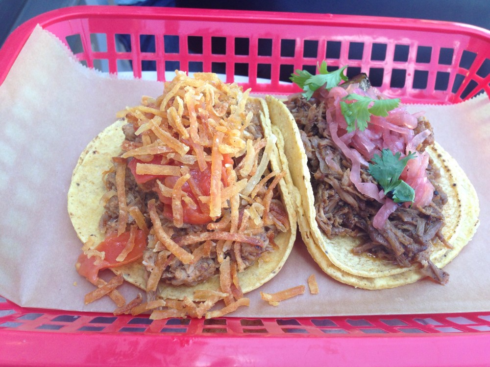 For my first of two tacos (see the featured photo for this post), I chose a mole con pollo taco. Its rich gravy was a nice mix of savory and spicy, topped with pepitos (pumpkin seeds). My second was a vegetarian black bean taco with shredded carrots, pickled jalapeños, and crumbled cotija cheese. The mole could have used a touch of sweetness to enhance its complex mix of ingredients, while the bean taco was a perfect balance of salt and tang. My friend ordered a braised pork shoulder taco, accented with crispy onions, and a beef brisket with pickled red onions (both pictured above). I tried the beef and would have ordered it had I returned.