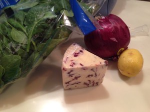 This salad can be made, start to finish, in under one hour. It is best served immediately, but If you are serving it in someone else’s kitchen, you can roast the squash and sauté the onion in advance. The trick is to avoid heating the spinach until just before serving, as spinach can easily over-wilt and over-cook.