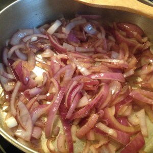 Meanwhile, juice the lemon and sauté the onions. Peel, rinse, and slice onion thinly. In a nonstick or cast-iron skillet, heat 1 to 2 Tbsp. (depending on the size of the onion) over medium heat. When warm, add the onion and toss to coat in the olive oil. Sauté for 2 minutes and reduce heat to low. Slowly sauté (starting the caramelization process) for another 5-7 minutes.