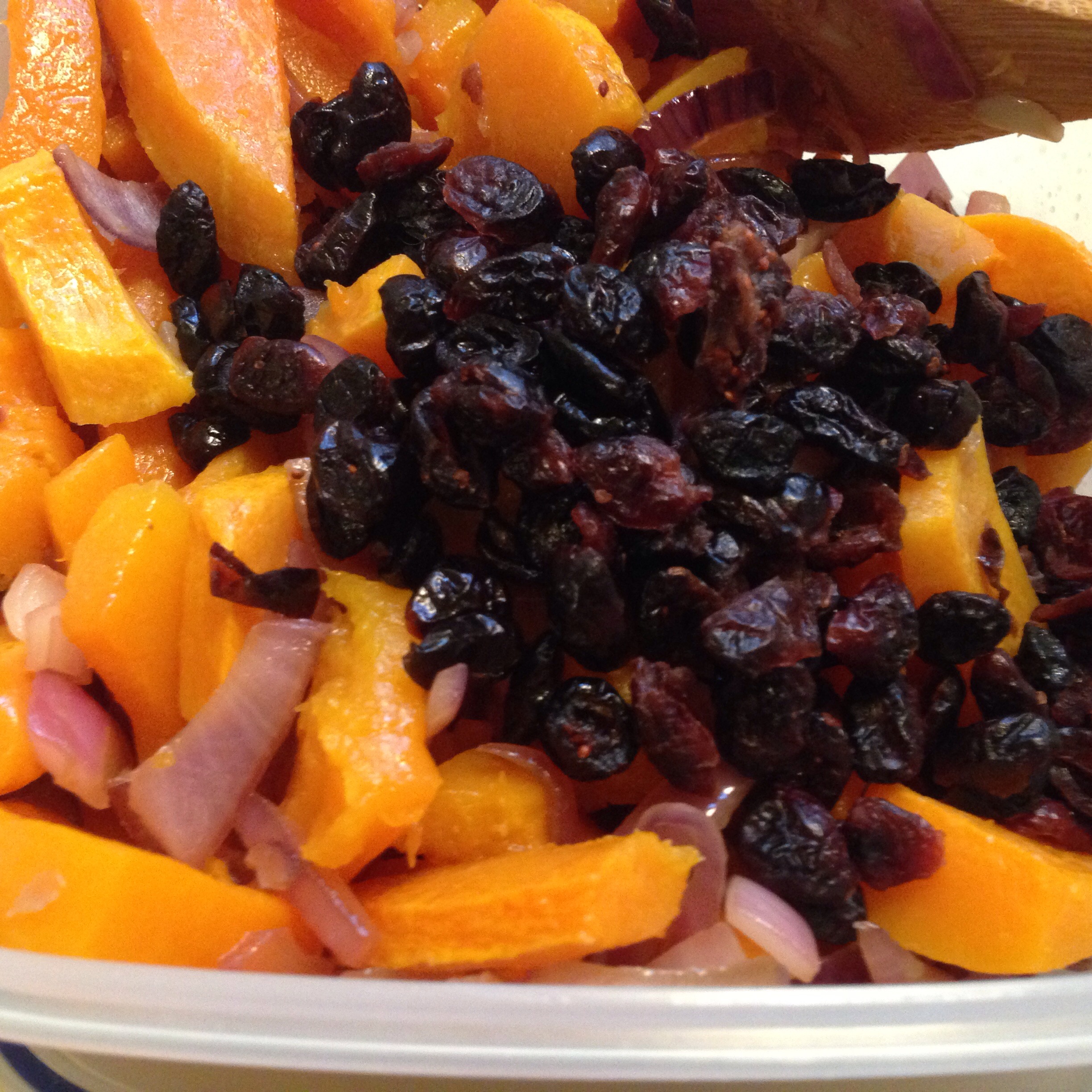 Warm butternut squash and spinach salad with Stilton and cranberries
