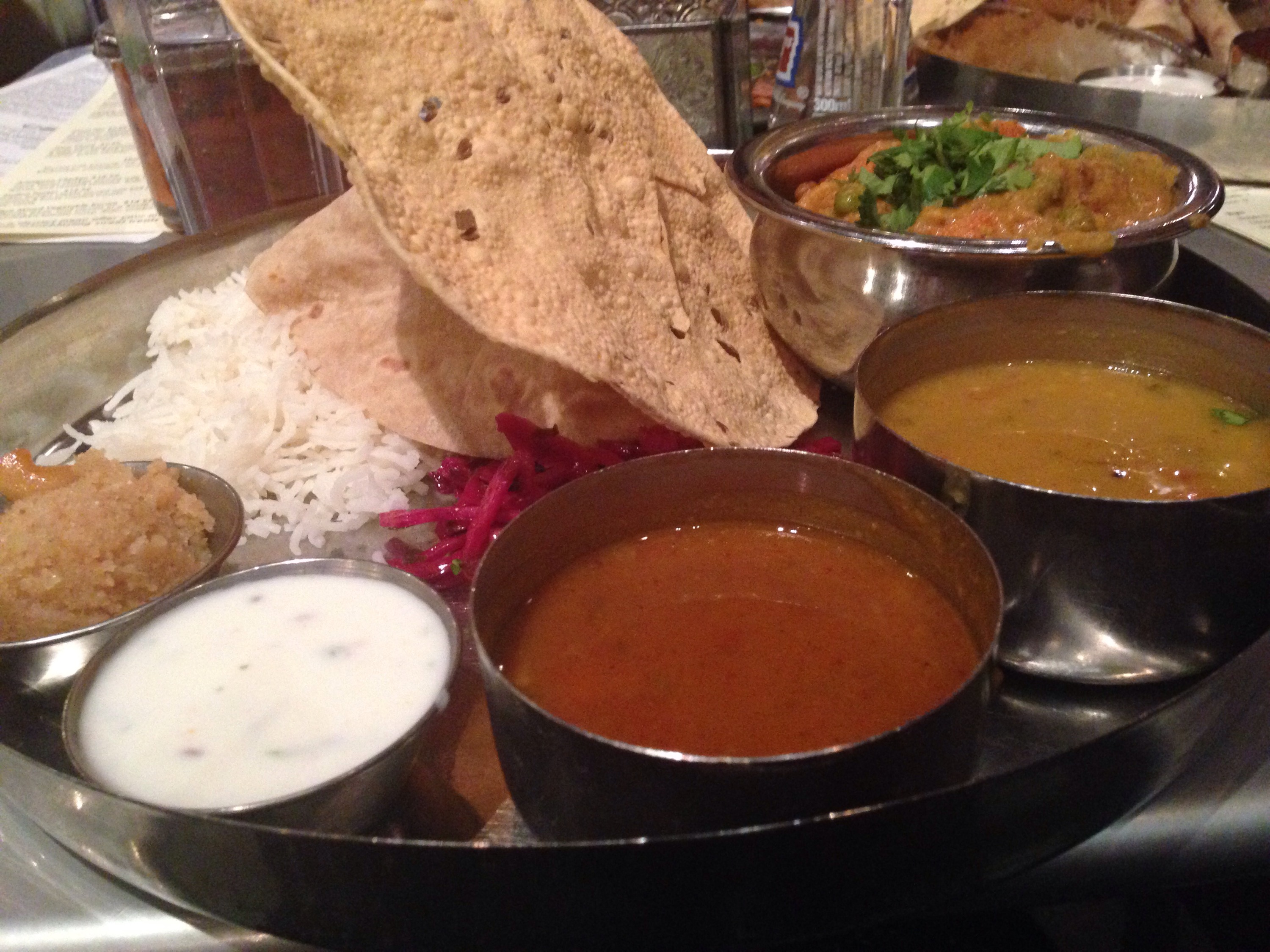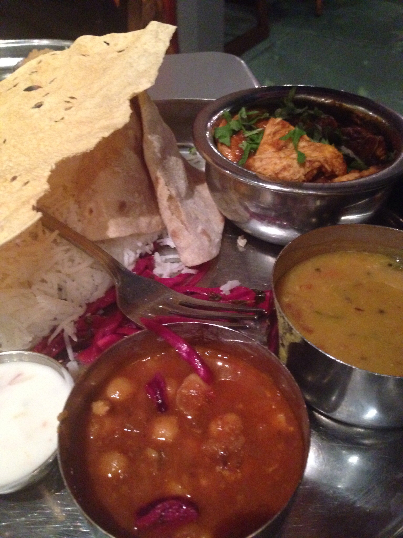 My family convinced me to order a full thali so that I could experience the restaurant fully. A thali is a traditional meal that consists of a variety of small dishes and bites. Think of it as the Indian equivalent of a bento box. At Chai Pani, it is equally as beautifully presented as any bento. Their thalis consist of a main dish, choices of which vary daily and an accompanying, complementing side dish; along with dal (stewed lentils), various starches – crispy, salty papadum, wheat roti (tortilla-like flatbread), and basmati rice, condiments, and a small dessert.