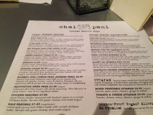 I can’t rave enough about Chai Pani. Brought by relatives for a “fun” (their endorsement) Friday night dinner outing, I found myself a little skeptical when I saw what looked to be a diverse, yet very educated, bourgeoise crowd and mostly Caucasian wait staff. I know, I know, that’s bias, right? But please tell me that you have never once done the same. We all tend to crave authenticity of cuisine – and superficial indicators of it don’t hurt.