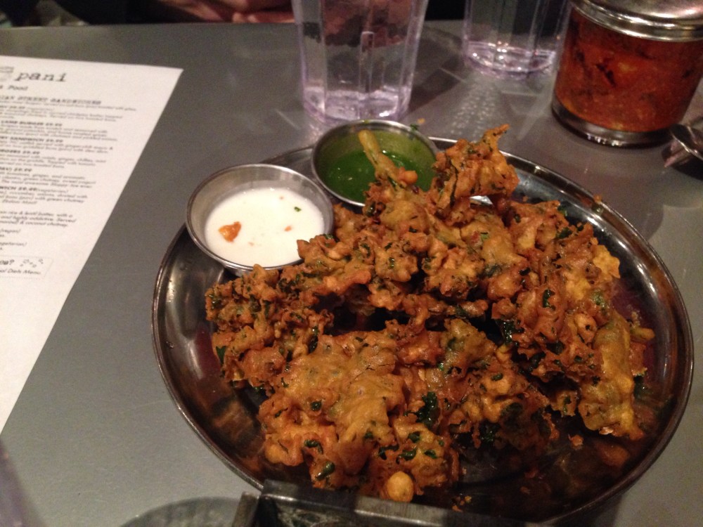 The meal I actually ate that night started with kale pakora. If you are not familiar with pakora, think of it as its cousin, tempura, but battered with chickpea flour. One might consider battered and deep fried kale to be blasphemy both to whole food purists and actual Indians, but Pani Puri notes that kale does grow in southern India, so why is the idea so far-fetched? Though I generally am not a huge fan of deep fried food, one bite convinced me that kale pakora might be the best idea ever. Or at least of the day. I later described it to a friend as “kale chips on steroids”, and it seems an apt description as any. It was served with both traditional green chutney and a tangy yogurt dip (not raita). Other appetizers ranged from bhel puri to samosas to Bombay chili cheese (Kheema) and okra fries.