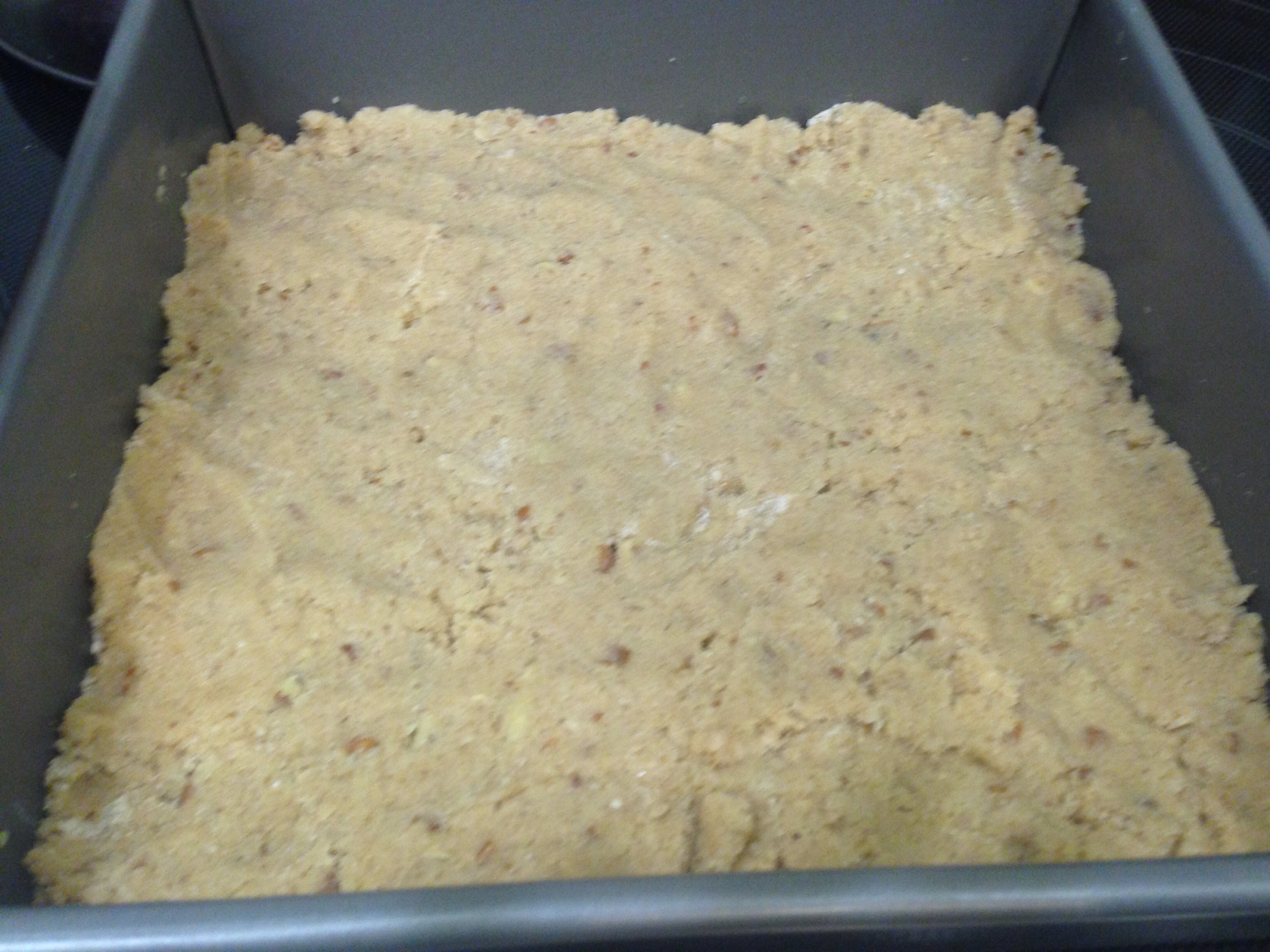 Press about 2/3 of the mixture into the baking dish, leaving at least 1 cup of dough in the mixing bowl to top the bars. Ensure an even layer covers the pan fully.