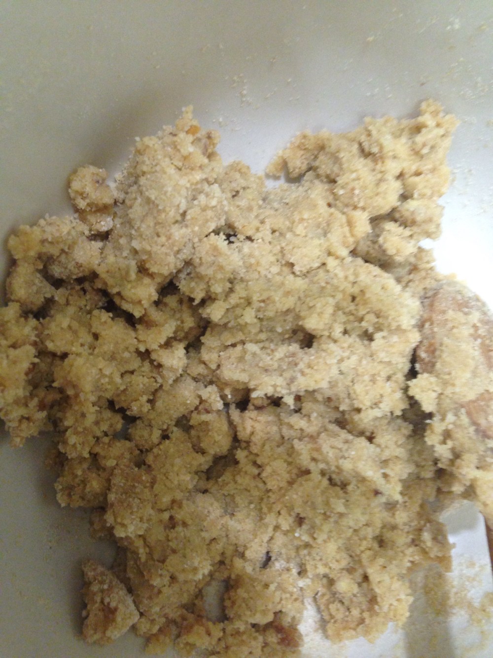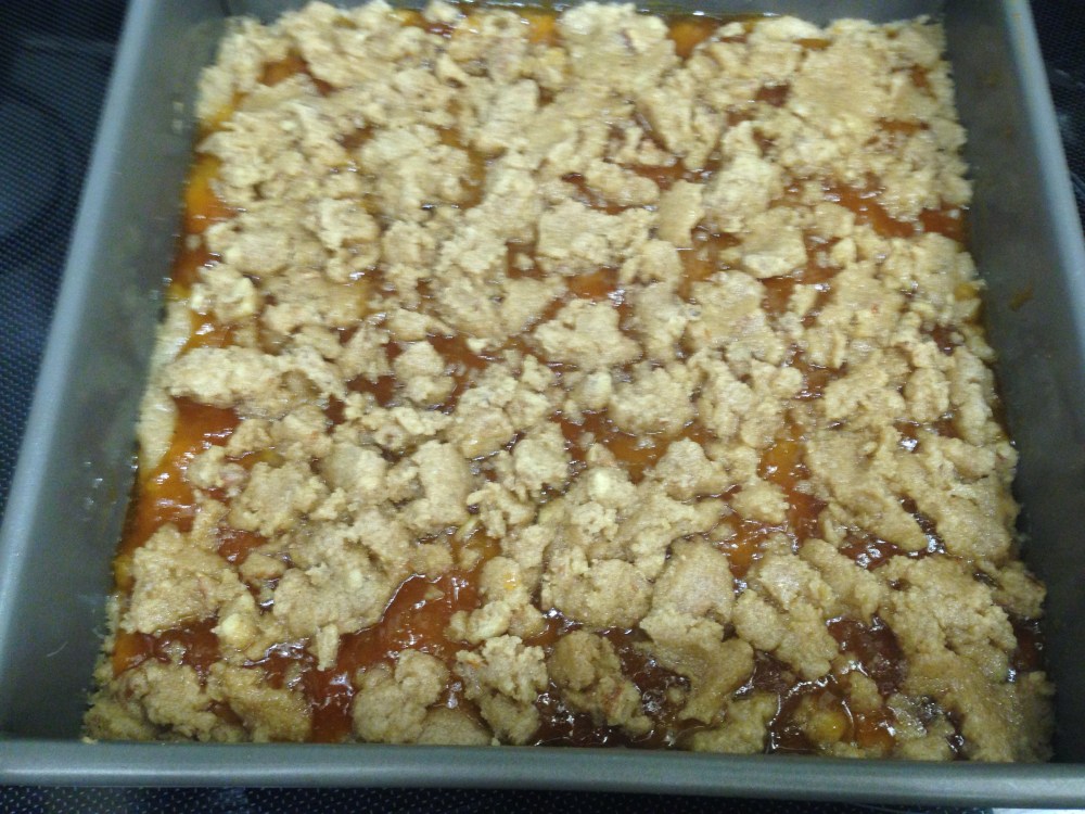 Next, spread the jam/preserves in a thin layer to cover the pan. You may leave about 1/4″ uncovered by jam along each edge to prevent sticking/burning (less of an issue in a glass baking dish). Crumble the reserved dough atop the jam layer, covering as much surface as possible.