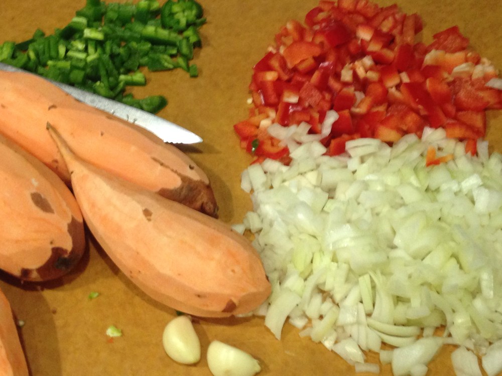 - 2 lbs. sweet potatoes (about 3 medium or 6 cups chopped), peeled and diced to 1/2″