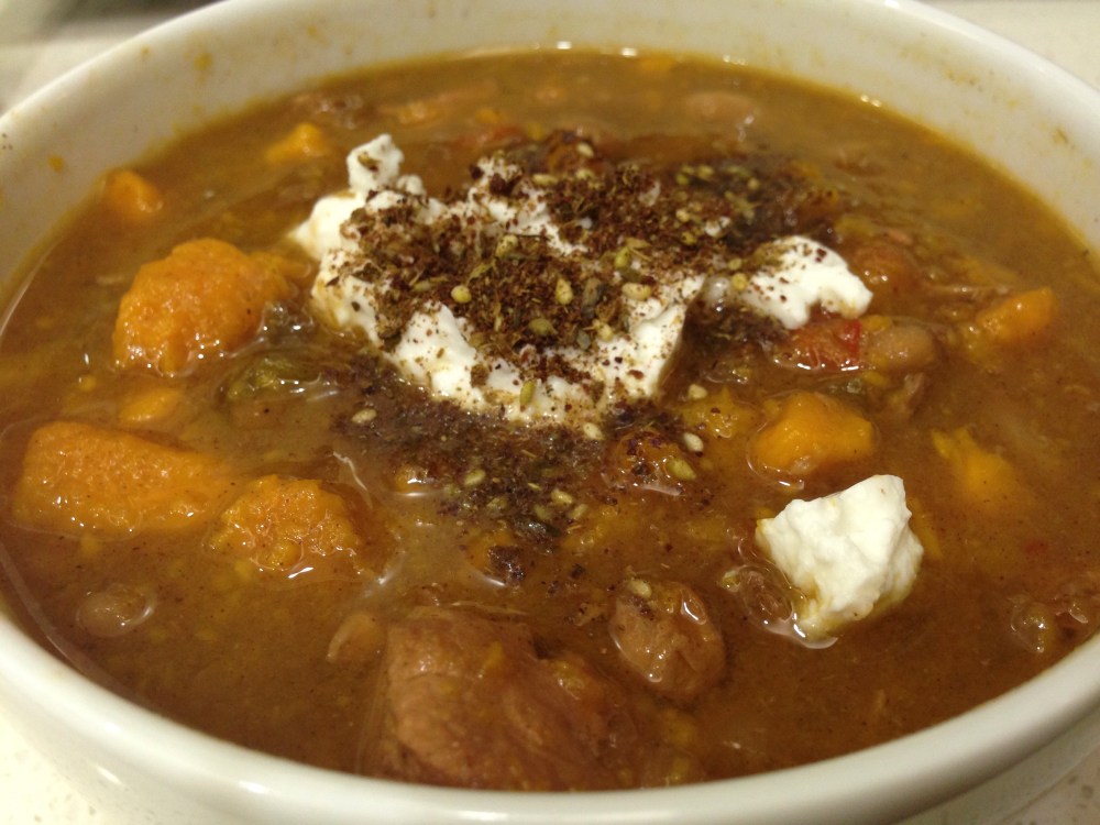 Here’s my secret: by combining a curry powder with pumpkin pie spices, you’ll manage to hit most of the more subtle spices in American, Middle Eastern, and Indian cooking. Just be careful on proportions and ALWAYS keep ground ginger and cinnamon on hand. My #3 spice blend (but #1 for garnishes, cold dips, etc.) is za’atar. In this case za’atar is more widely associated with Levantine (eastern Mediterranean) or Arabian cooking than North African, but it helps round out the sweetness of the chili for those that want a more savory dish.
