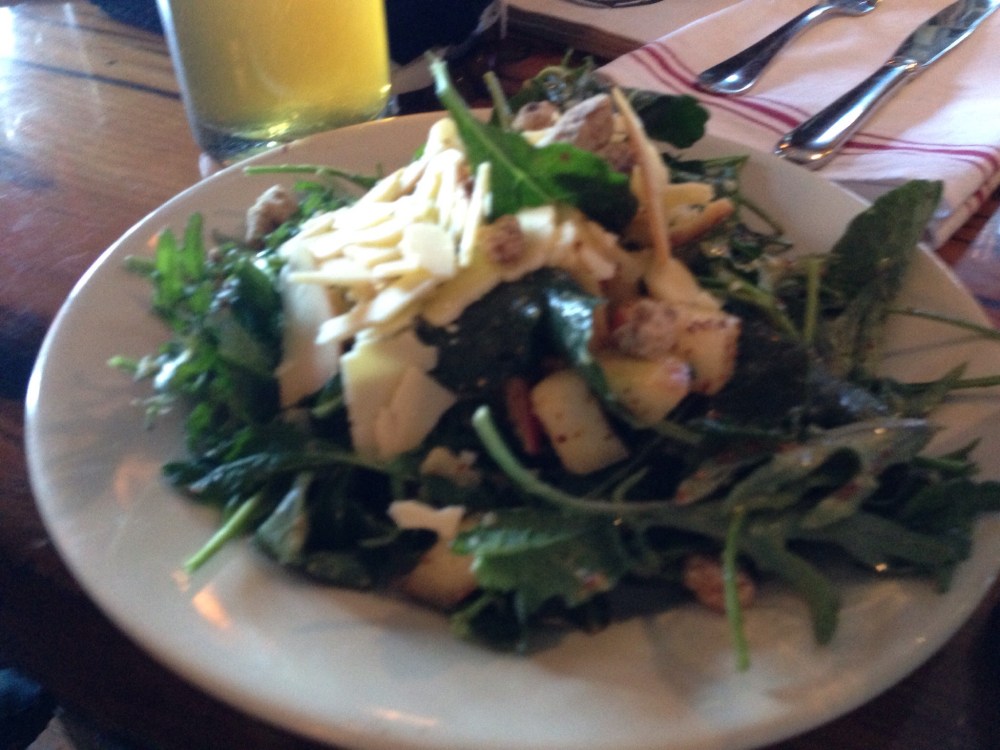 The pretzel was the perfect dose of tasty carbs to alleviate hunger. The cheese was akin to a pimiento cheese, bound together with a hint of mayonnaise. It was tasty, but I am anti-mayo and almost always detect it instantly. I preferred the stone-ground, beer accented mustard instead as an accompaniment. The salad was hearty and filling, and its bold stone-ground mustard vinaigrette was an interesting choice for a salad that otherwise emphasized the contrast between sweetness (apples, candied walnuts) and saltiness of shaved cheese. The mustard vinaigrette might have been perfect if toned down a little and sweetened with a touch of honey, IMHO.