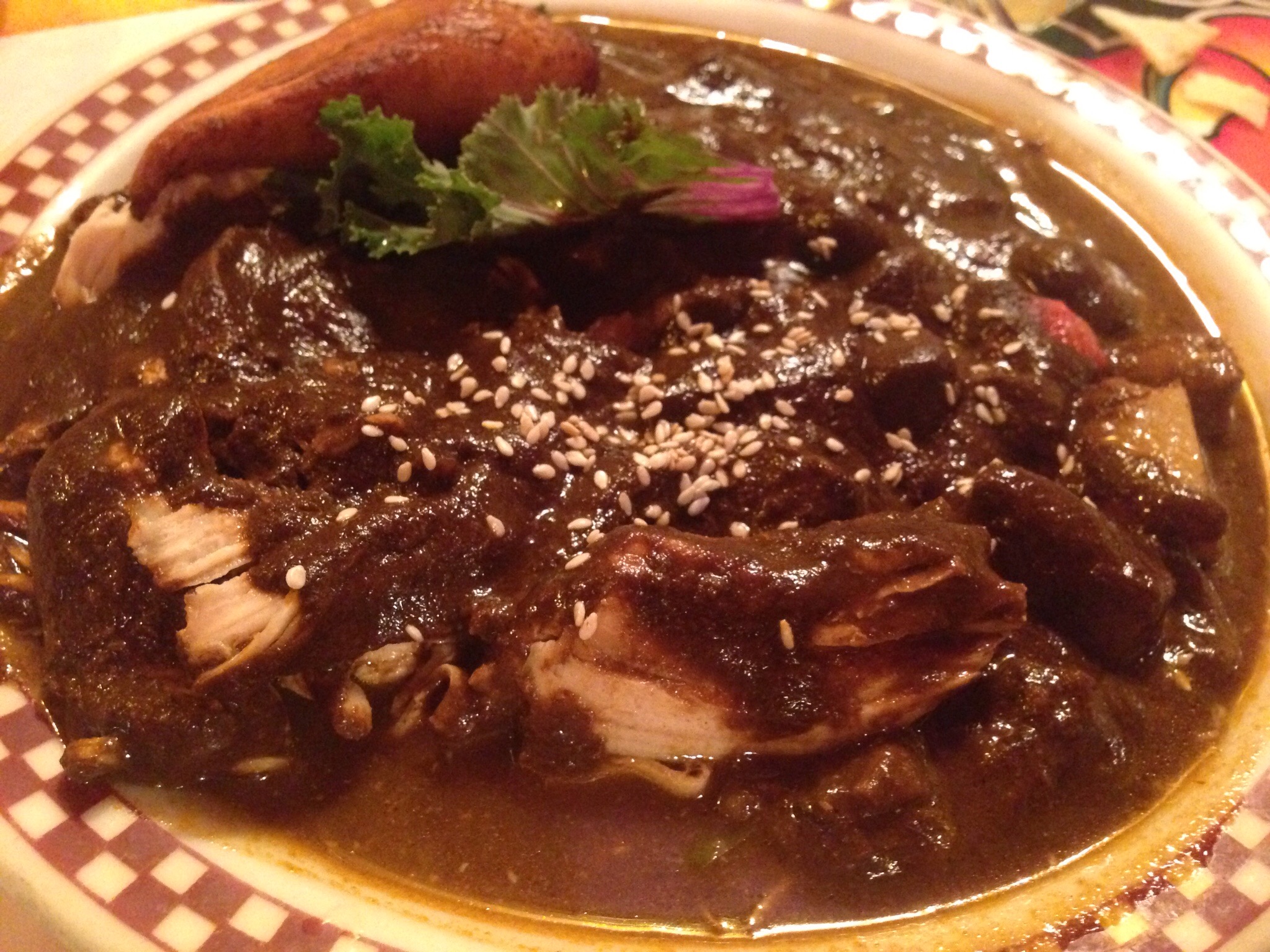 Anyway, molé, known in the rest of the world as an Oaxacan dish, is an incredibly complex sauce that I myself want so badly to make myself. I am a bit terrified of the steps involved: toasting, sautéing, blending, and repetititon. The simplest way to describe it is a Mexican version of curry, or as a kitchen sink” sauce – a of seemingly incongruous ingredients – chicken or other stock, toasted seeds, chiles, dried fruit, other spices, and chocolate. Molé should make your mouth sing; the resulting flavors are far better than the sum of each individual ingredient – richly sweet, savory, and spicy. The traditional Oaxacan molé prominently features dark chocolate, chile, raisins, pumpkin and sesame seeds.