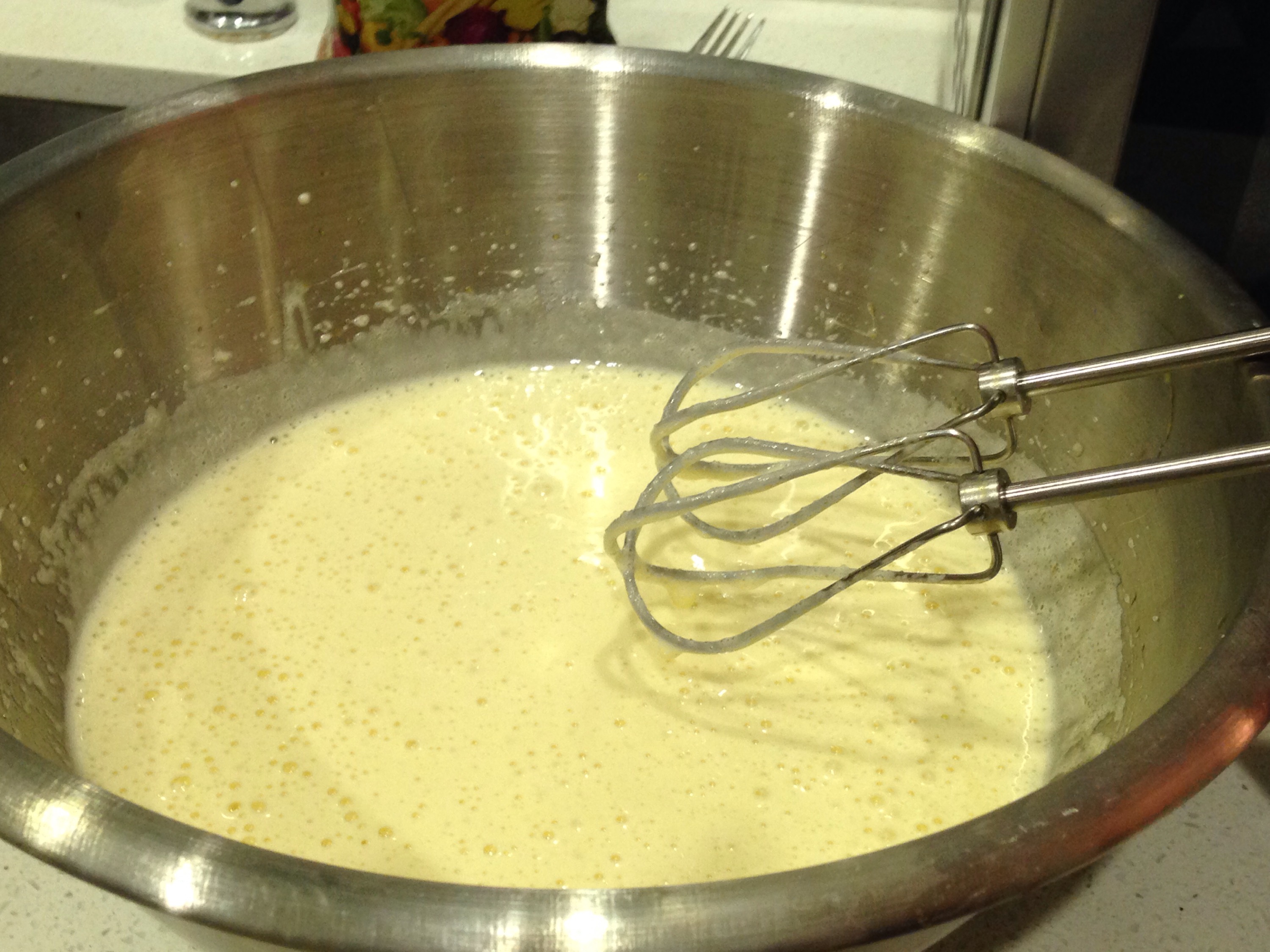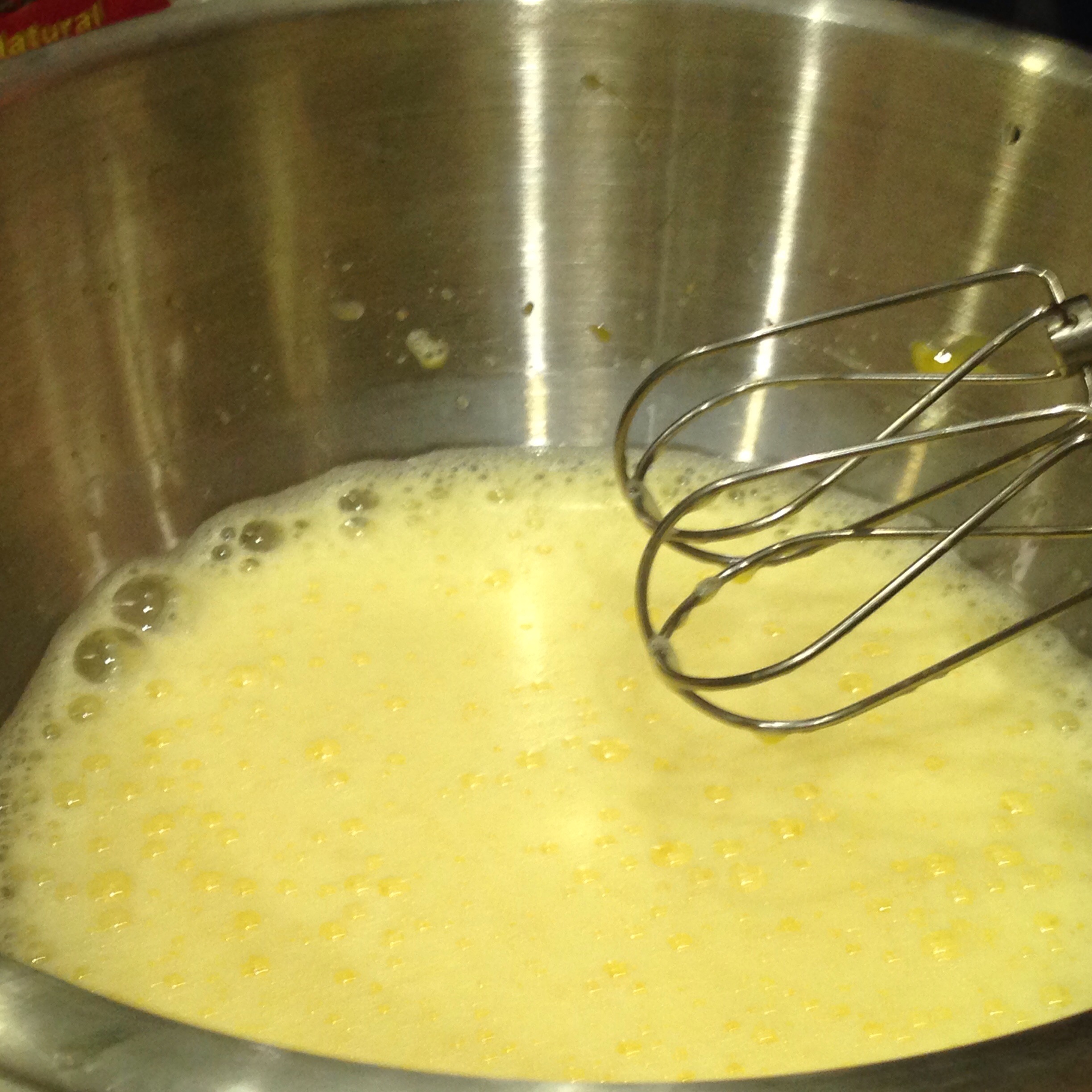 Meanwhile, in a large mixing bowl, beat eggs using an electric mixer on a high setting, for 1 1/2 to 2 minutes, or until pale yellow and frothy. Add in sugar and continue to beat until the mixture thickens and begins to hold its shape slightly (about another minute).