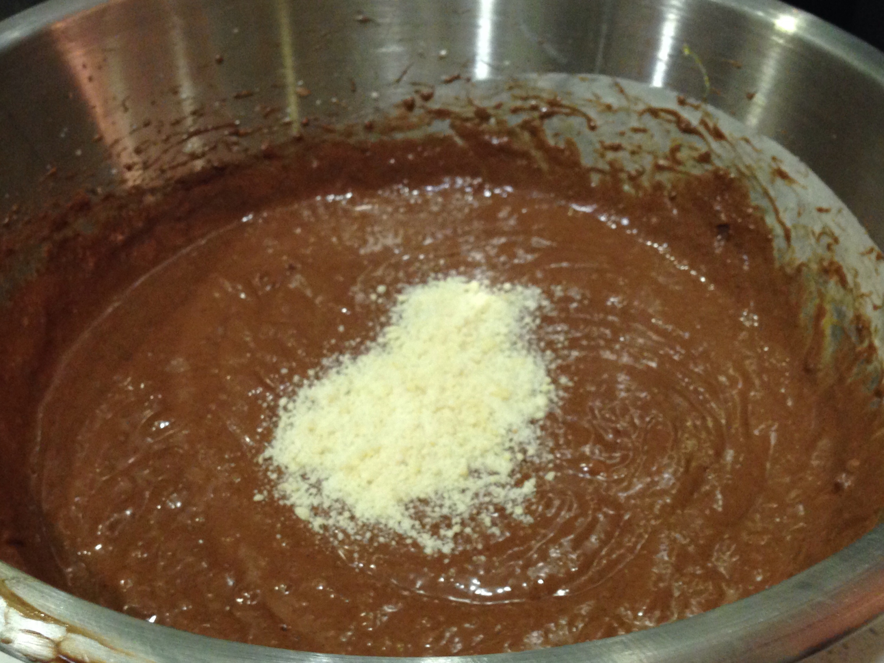 Beat in cooled chocolate/butter mixture, vanilla, salt, and almond extract. Sift cocoa powder into the mixture and beat.