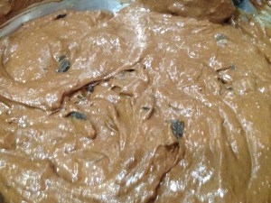 Remove mixer. Fold in the almond flour with a spatula until just incorporated – do not overmix. Fold in chocolate chunks if desired. Pour into greased pan.