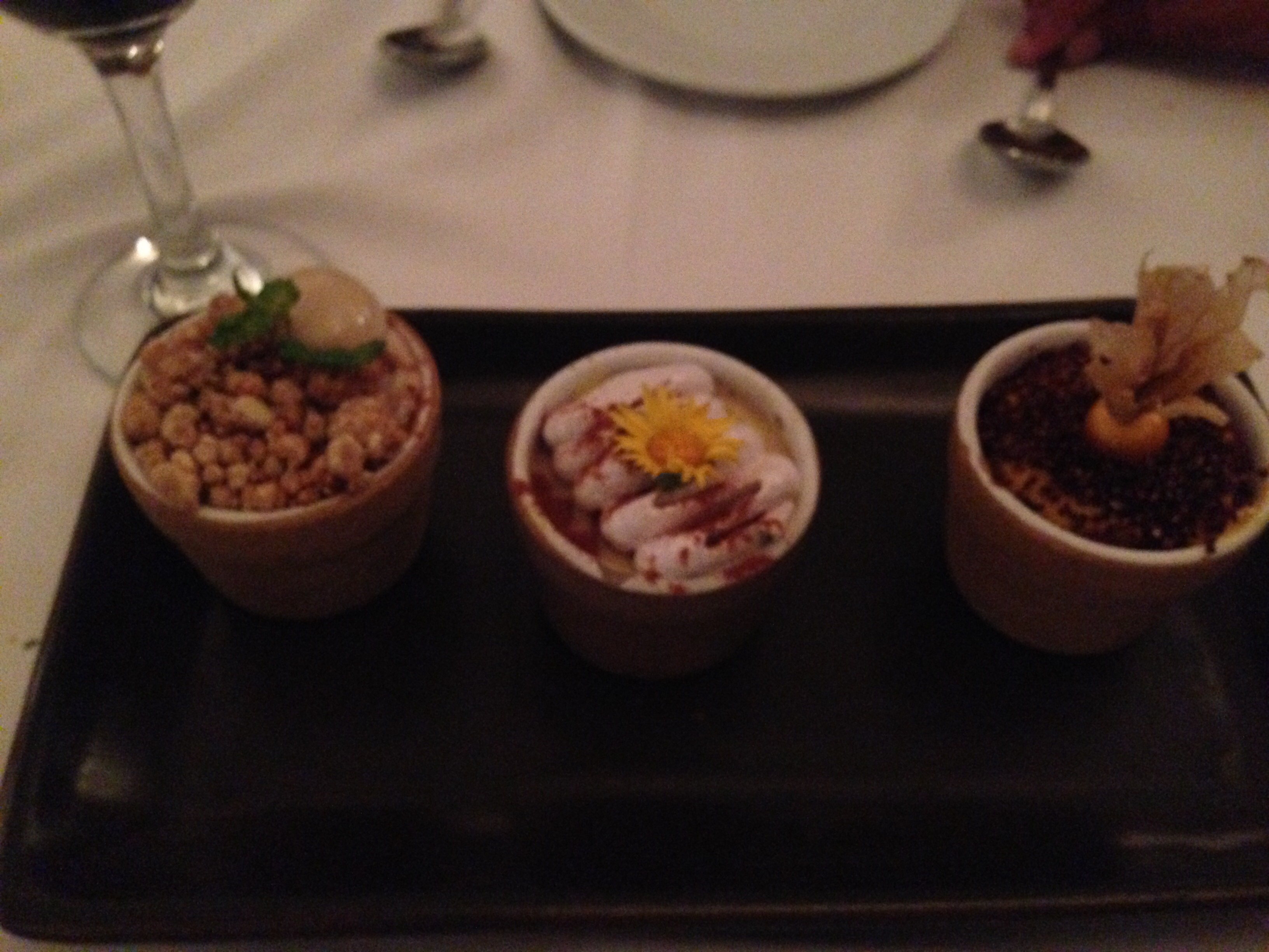 In fact, our second dessert was a trio of dessert pots (literally served in miniature flower pots) and included a lucuma-chocolate parfait. A subtly lemon-flavored suspiro (custard made with condensed milk) was served atop the slightest bit blink-and-miss, fluffy cake and topped with merengue comprised the second pot. The third was rice pudding flavored heavily with cinnamon and vanilla. He three pots would have been enough for the four of us, but we would have lost out on unique flavor combinations had we not ordered both desserts.