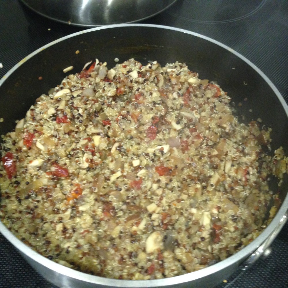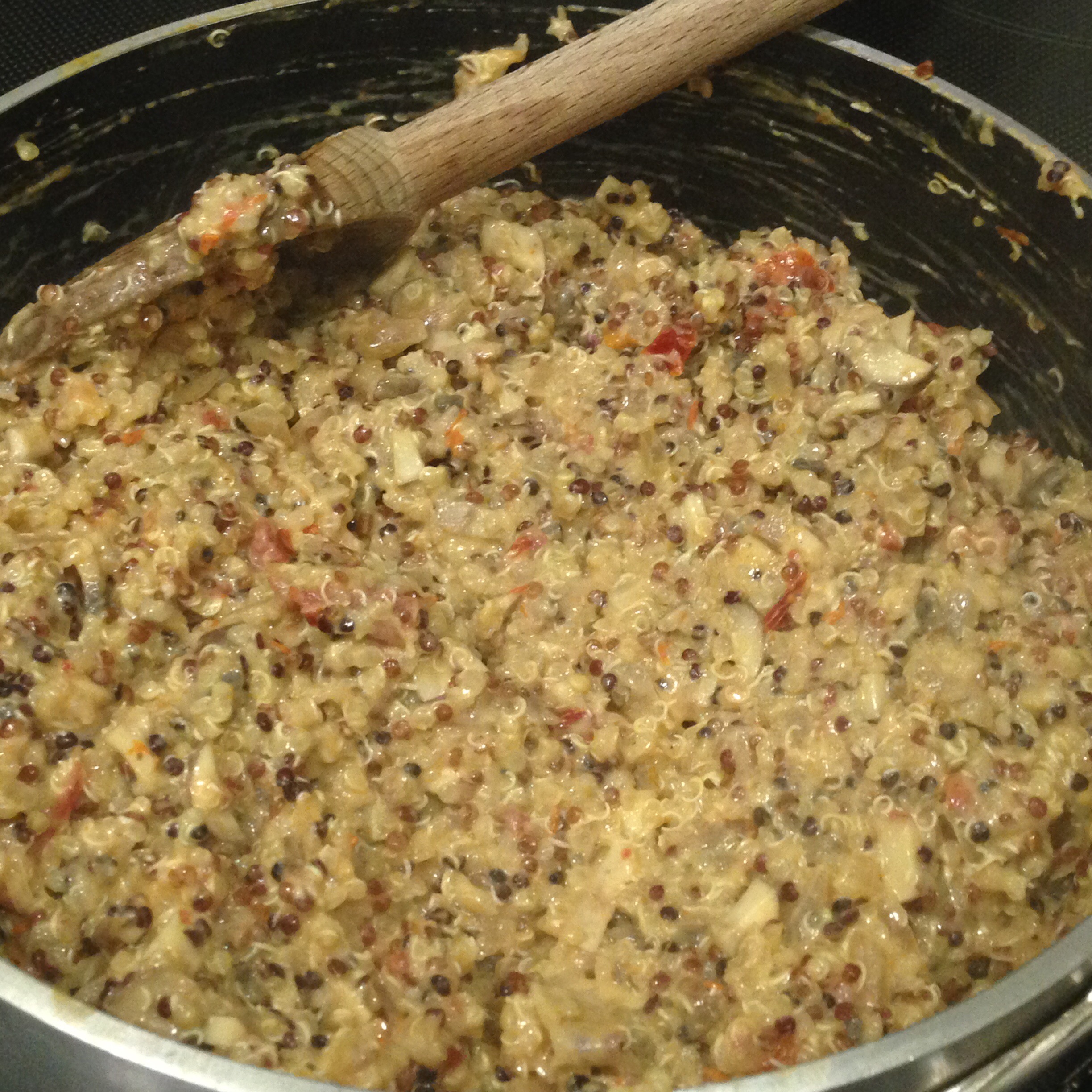 When the quinoa has absorbed all but a small amount of liquid, add in the wine if using and allow it to heat and evaporate. Next, stir in the vegetables until fully incorporated, over medium low heat.