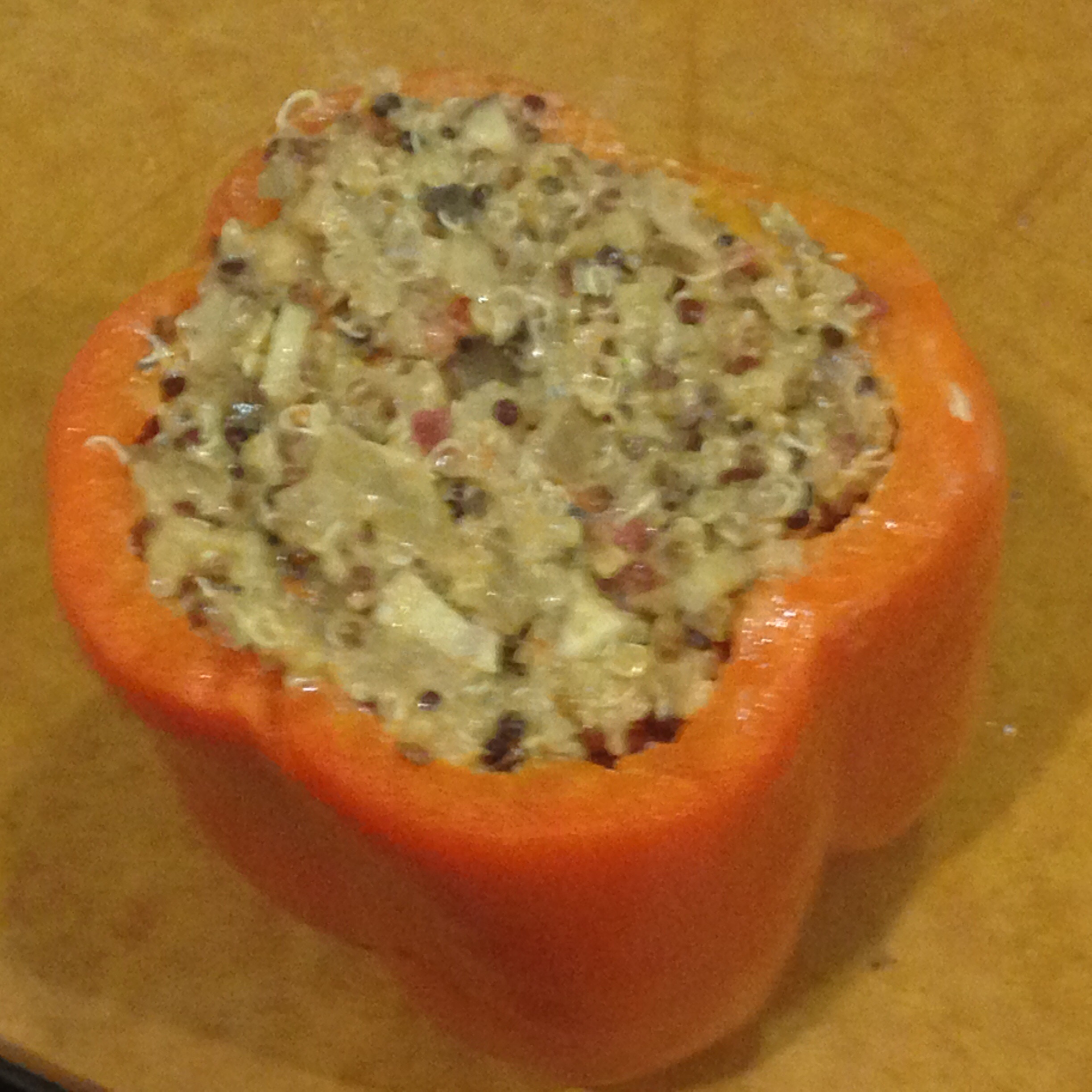 Stuff each pepper with roughly one cup of the quinoto, leveling off. Spread a few teaspoons of goat cheese atop the quinoto. Wrap each pepper in aluminum foil. If not serving immediately, refrigerate until approximately 45 minutes before serving; preheat oven to 400 degrees.