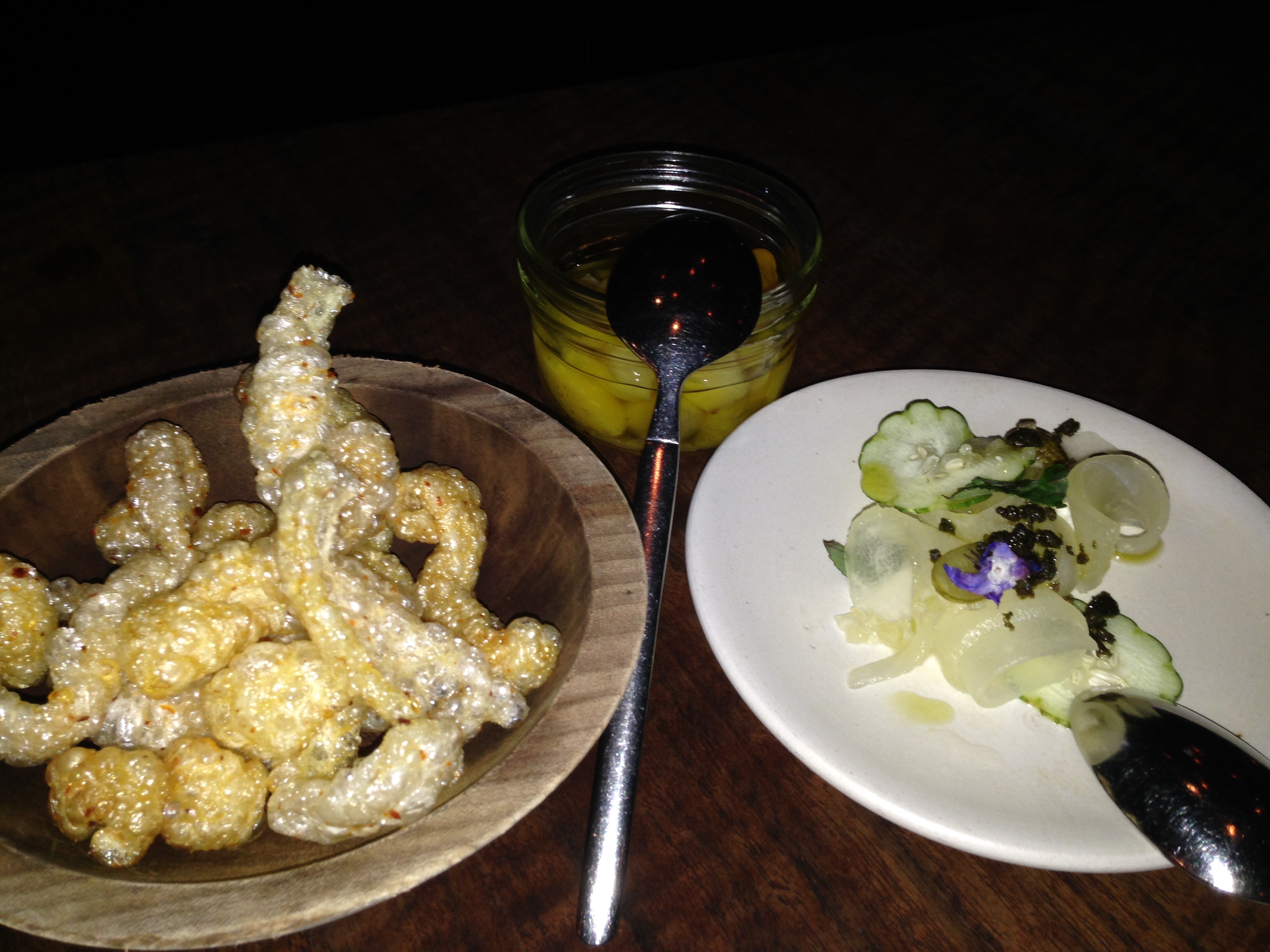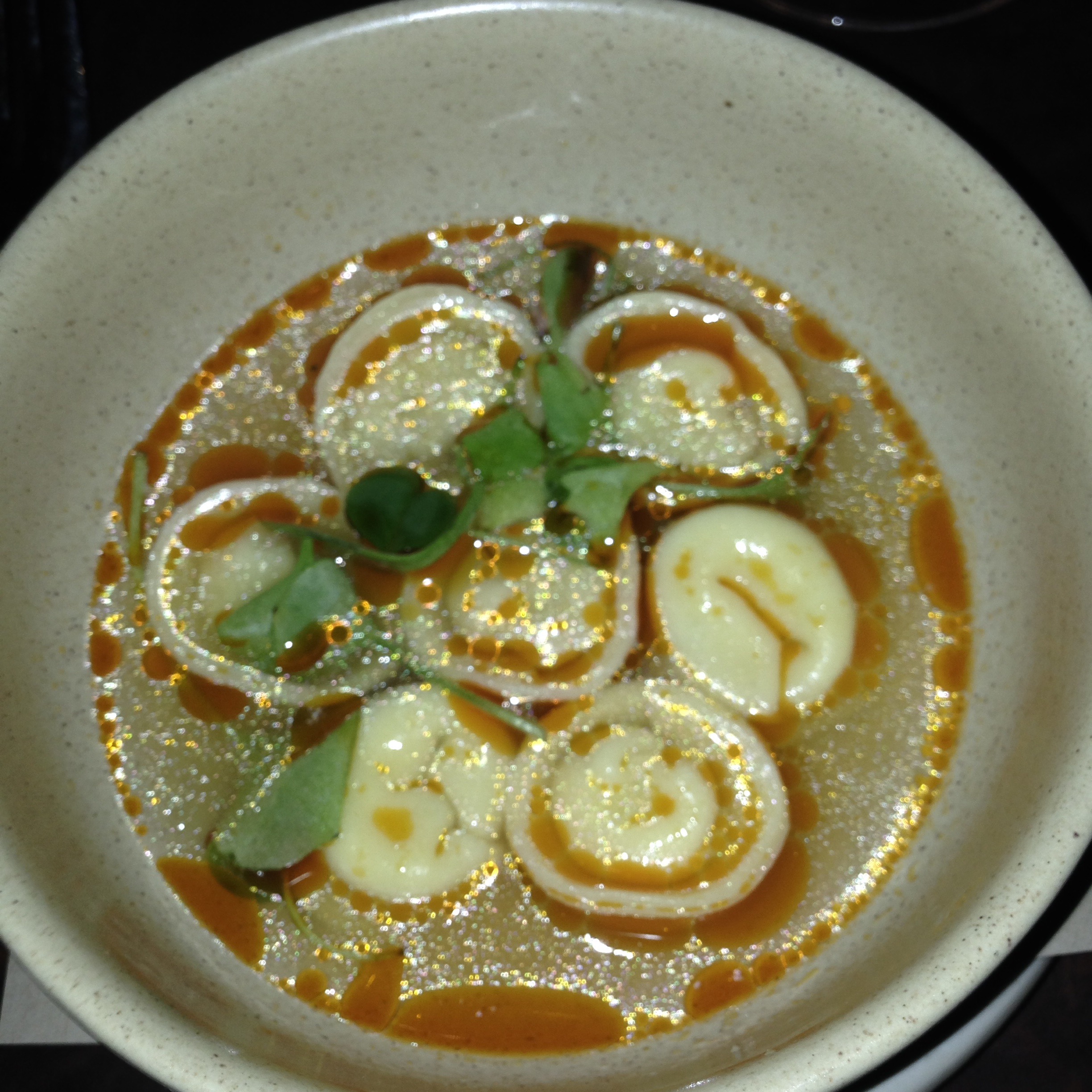 The meal began with the spuntini: pickled yellow Cherry tomatoes; a re-imagining of pork rinds, and a sort of cucumber carpaccio. It was paired with a non-vintage sparkling wine made in the methode Champenoise with Chardonnay and Pinot noir grapes.