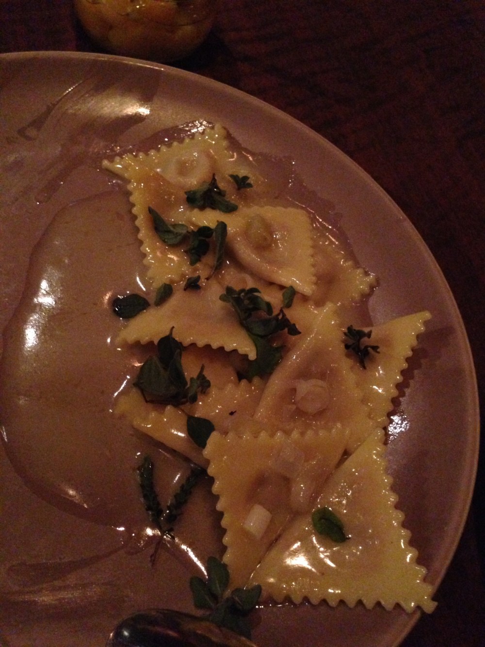 Course two was an unexpected tortelloni-like cappelletti pasta stuffed with halibut in a light broth. I am not usually crazy about fish, much less the idea of it inside pasta, but I was pleasantly surprised. The halibut had a very subtle, smoky flavor, and the broth added a mild, light enhancement. The wine was another native Italian grape, timorasso, which is in the midst of a rebirth after nearly becoming extinct. Though aromatic, with a hint of stone fruit like a Muscat, it was overpowering for me. A few Italian acquaintances later noted the producer was one of the weakest in Piemonte and advised me not to judge this grape negatively.
