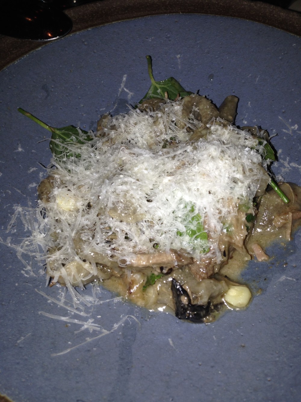 Course four was the first non-filled pasta: thick ribbons of pasta like pappardelle with a hint of mild Aleppo pepper topped with a rich rabbit ragu with a welcome tartness of Meyer lemon. It was paired with a red wine from Piemonte, made from the esteemed, musky and tannic Nebbiolo grape.