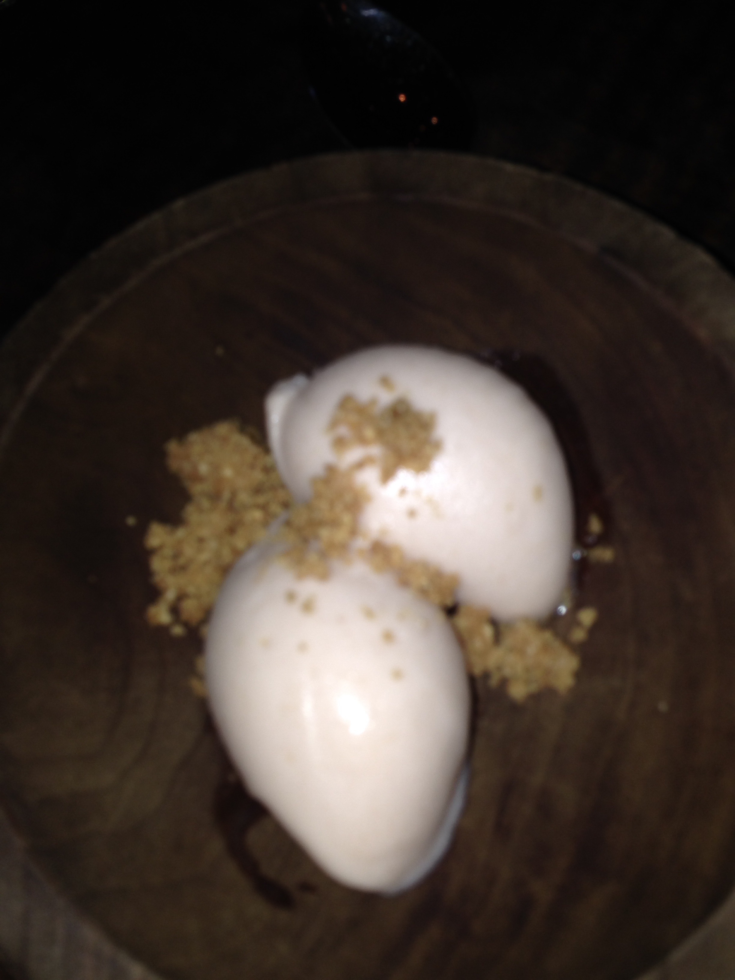 We concluded with a light dessert of stone fruit sherbet topped with crumbled hazelnut shortbread cookie and with a rich but not too sweet Asti Spumante from Asti in Piemonte.