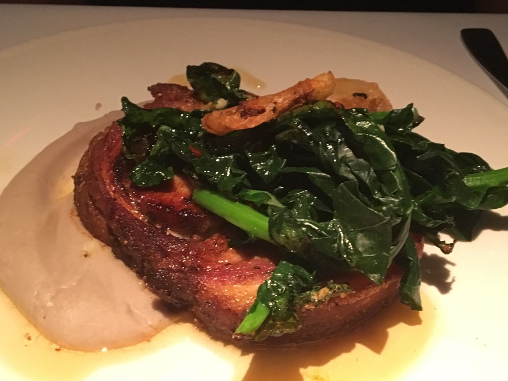 Dad chose cast iron porchetta made from “happy pigs raised at Devil’s Gultch Farm.” I don’t know about the rest of you, but as much as I love the concept of “happy meat” and care about sourcing and animal welfare, I don’t want to think too much about the animal before I eat it. Tell me afterwards or just say “responsibly sourced.” If I want more info, I’ll ask. The porchetta was served with very garlicky dark greens (presumably broccoli rabe but more brilliantly green) and preserved lemons. My father couldn’t stop raving about the lemons, so I had to try a bit. The lemon was intensely tart and savory and was fantastic with my fish. I would recommend preserved lemon with the fish.