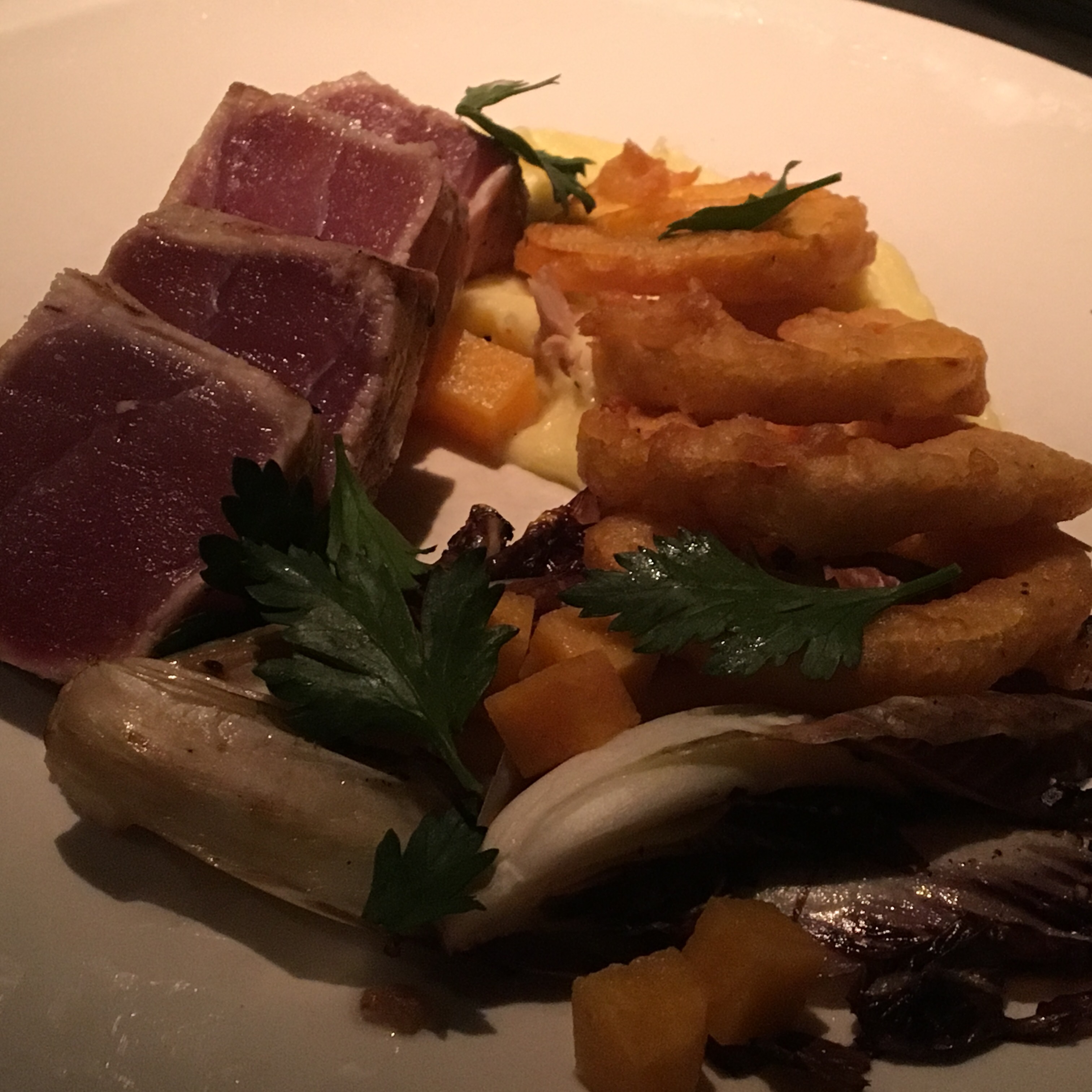 As for the main course, it was a no brainer: Seared Ahi tuna. The menu noted it was accompanied by “crisp sweetbreads.” I may love foie gras, but I draw the line at sweetbreads and refuse to eat them. I assumed the restaurant would not allow substitutions, but I forgot Rule #1 of catering to corporate America – bend over for your customers! Our awesome server, Ytem, happily offered to substitute their beer battered squash when I asked to omit the sweetbreads. That was perfect, because I’d been eyeing the squash as a side dish.