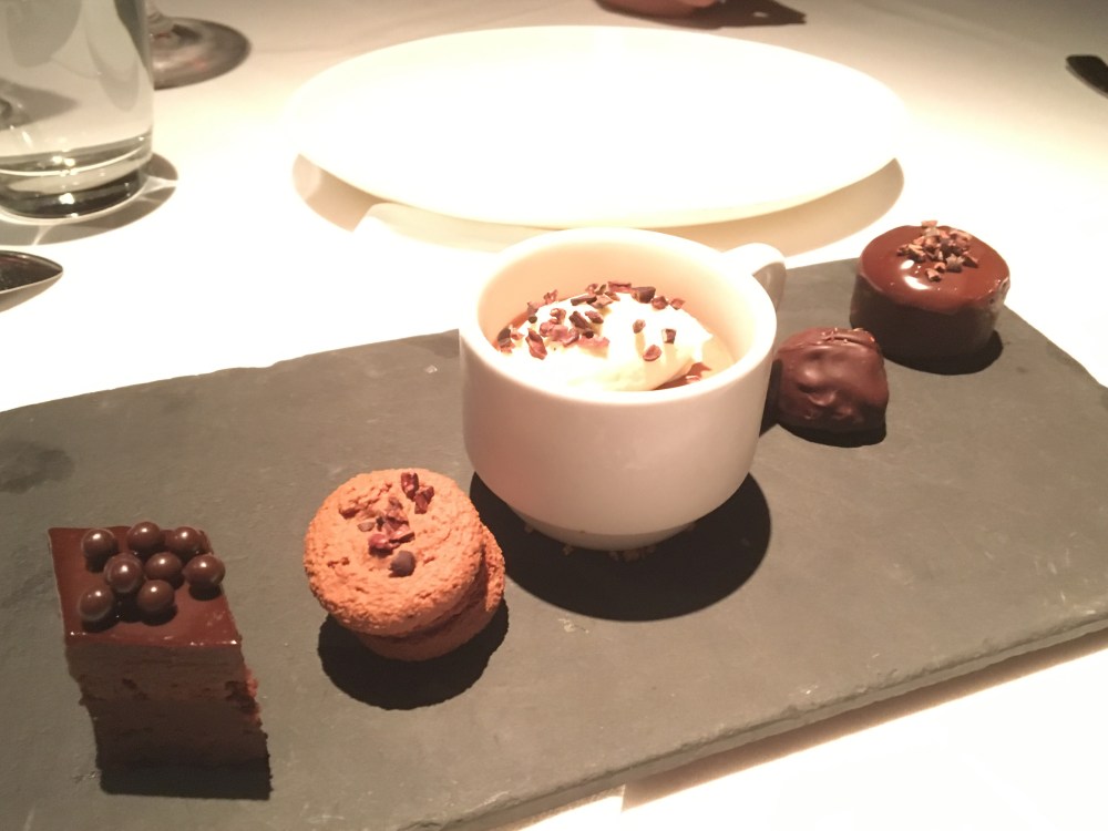 It would have stood alone, if it hadn’t been for dessert…Dad and I split the chocolate bites selection. Morsels of deep chocolate, each representative of a particular category of dessert, were better than I could have anticipated. A chocolate-cacao nib macaron, flourless chocolate cake, chocolate pot de creme, a truffle, and ganache-enrobed chocolate cheesecake graced the plate. It was difficult to choose a favorite, but the chocolate cheesecake was insane.