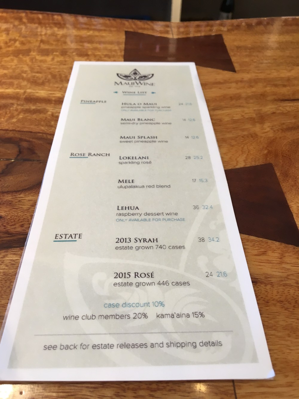 I had to try one wine made from estate grown grapes, and with Maui’s restrictive liquor laws, I had only one more to sample (note: go with a group so you can try one another’s three samples!). So I chose the Chenin blanc, which is among their most popular (but low production) wines. I’ll just say that it was a good start; it was a crisp, drinkable wine. It lacked the complexity of a Vouvray, a South African chenin, or even my favorite Chenin Blanc blend from California (Pine Ridge).