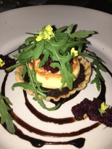 Having skipped lunch, I was the hungriest I’d been on my trip to Kenya, and my colleague had a bit of a scare owning to playing prawn roulette at dinner the preceding night, so we both chose starters: me a beetroot and goat cheese tartlet and him that African staple, spicy chicken wings (sarcasm). The tart was layered, with caramelized beets and onions lining the shell and crowned with goat cheese.
