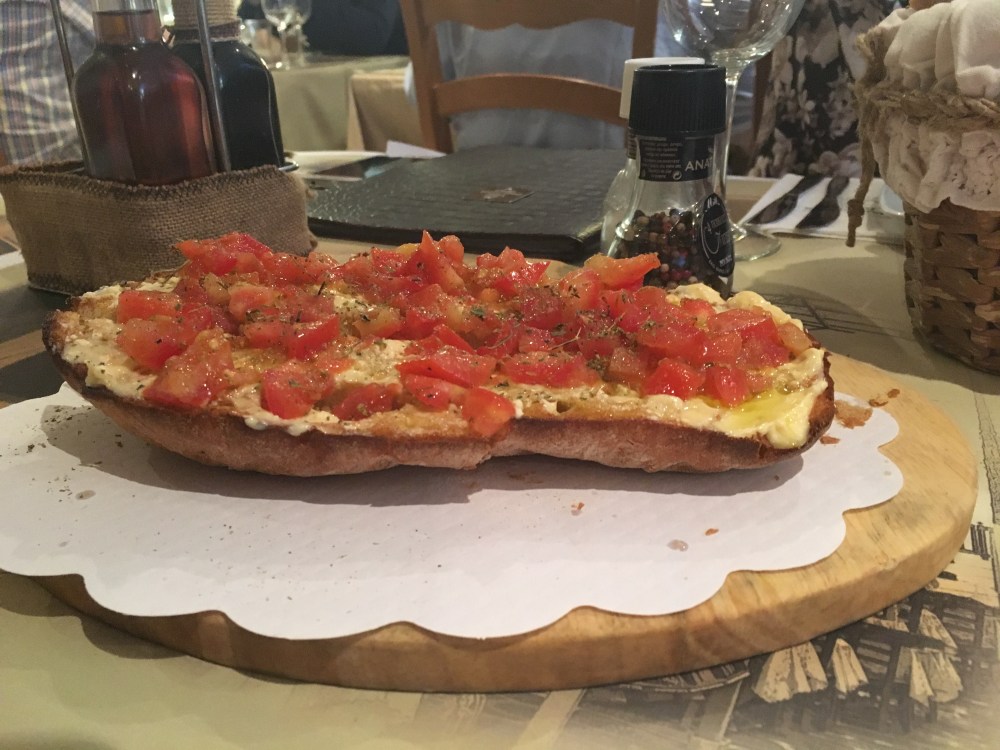 Our group started with a few appetizers, most of which had a decidedly Greek flair. A large, crusty loaf of bread formed the base for a Greek bruschetta that layered traditional crushed tomatoes atop the spicy, funky local Myconian cheese.