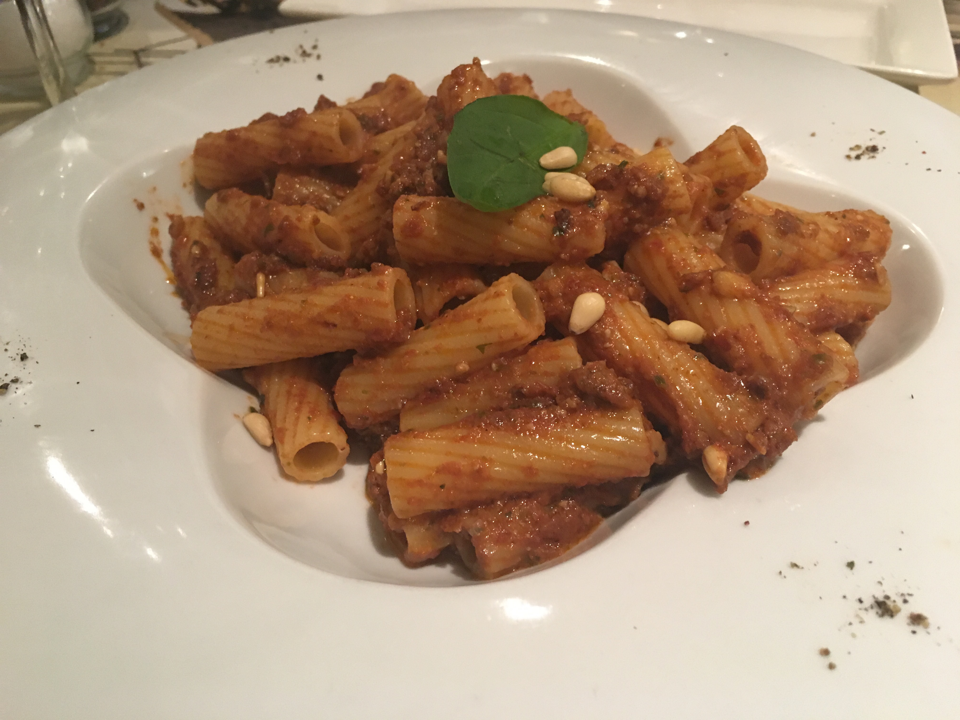 I chose the rigatoni pesto rosso (red pesto) after significant deliberation. I prefer ridged rigatoni to its sister penne, as I find sauce clings to its ridges much better, and I don’t find sun-dried tomato pesto often on the menu. It was fresh and delicious. Though it wasn’t quite as garlicky as I would like, it was delicious, and the pasta was perfectly al dente.