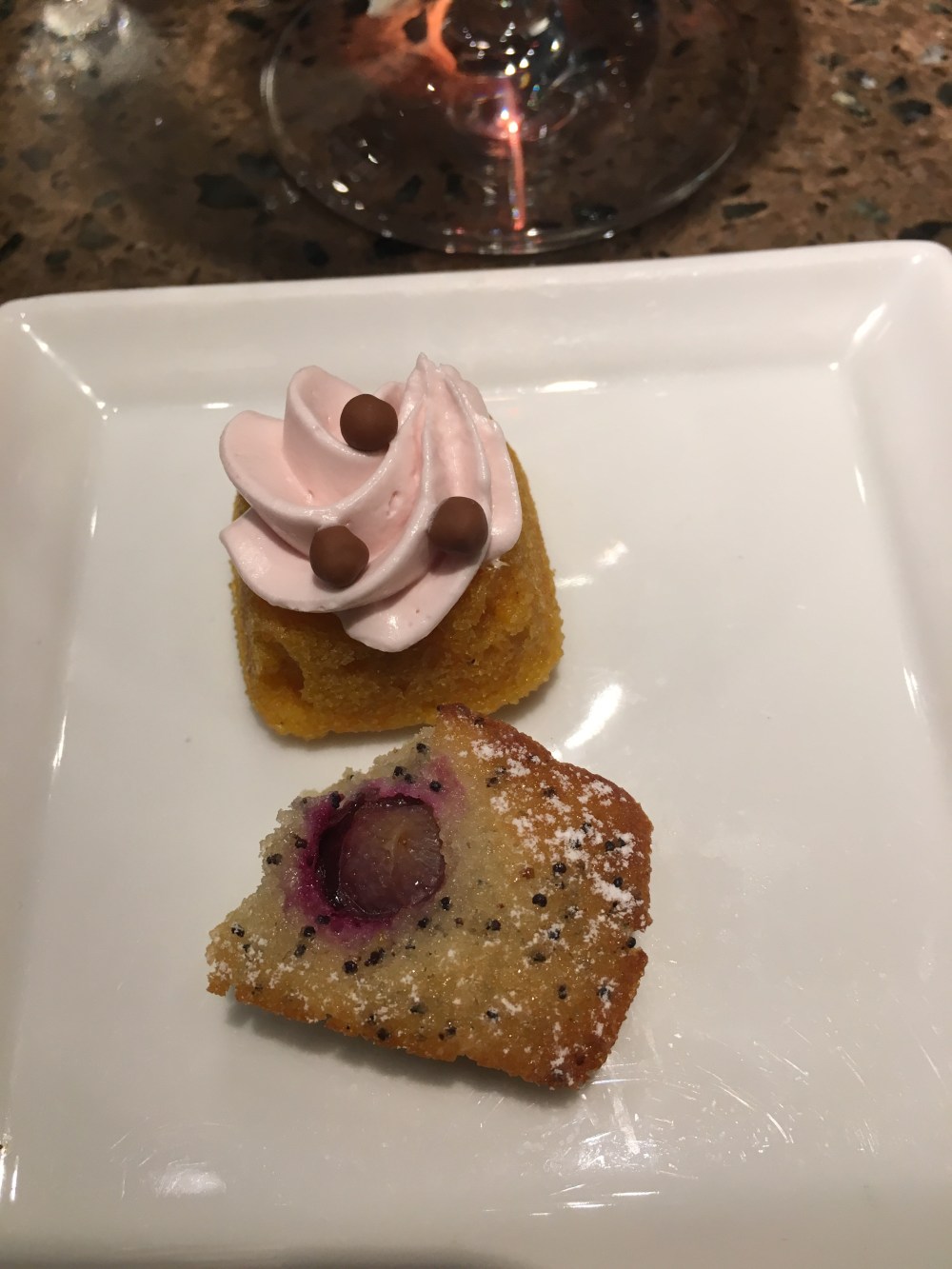 I willed myself to skip dessert, but the restaurant makes the check a bit sweeter with a tiny cake duo. Tonight’s consisted of a poppyseed blueberry financier and “the world’s smallest carrot cake” with a dollop of berry buttercream. Both had lovely essences of orange and lemon zest. They were the perfect ending to a wonderful culinary welcome to Vancouver, BC.