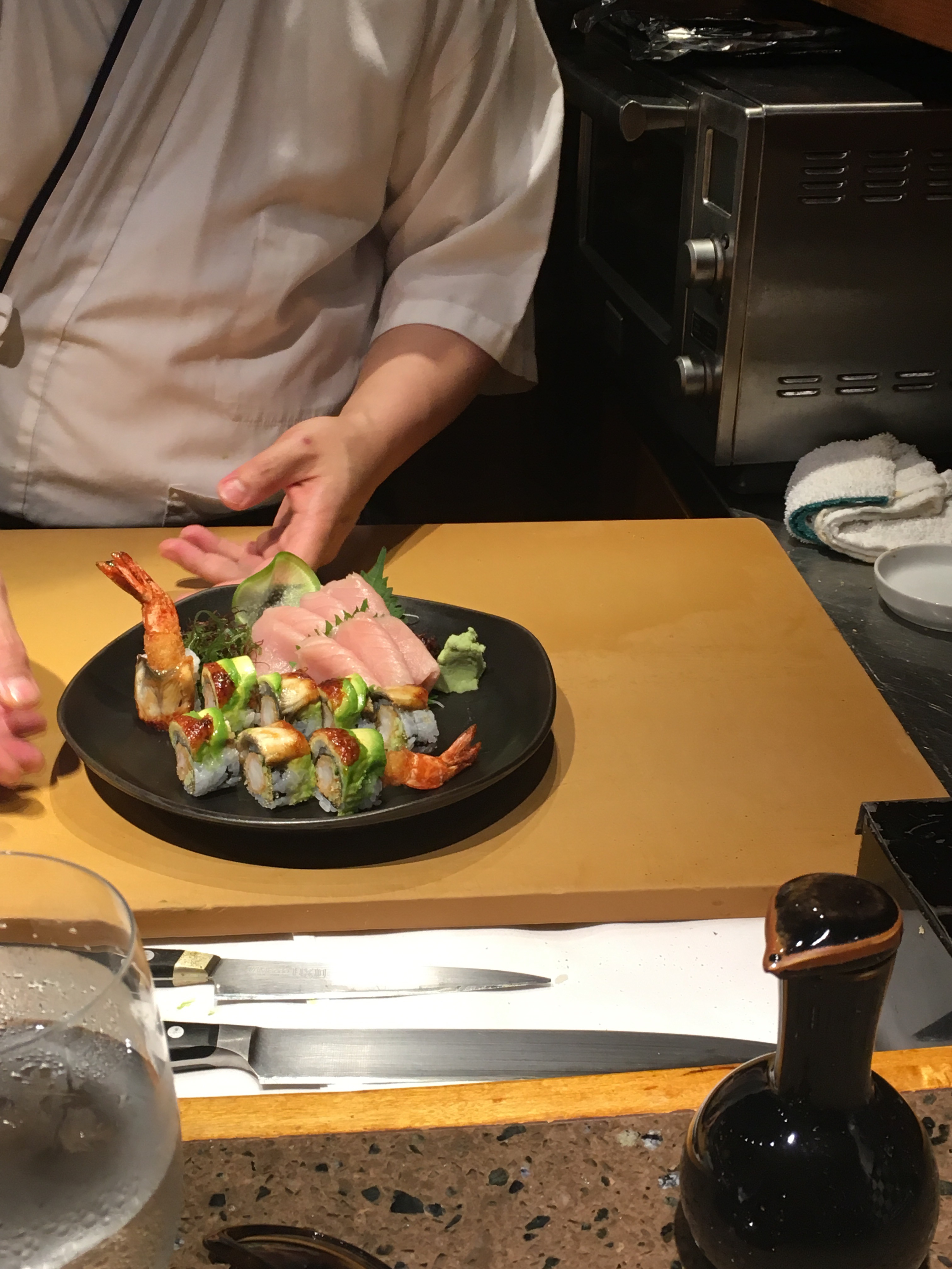 To my delight, a seat opened up at the sushi bar, giving me a view of culinary art in progressed. The sushi chef, one of four working the counter, appeared mildly amused as I watched and photographed his handiwork while waiting for my food.