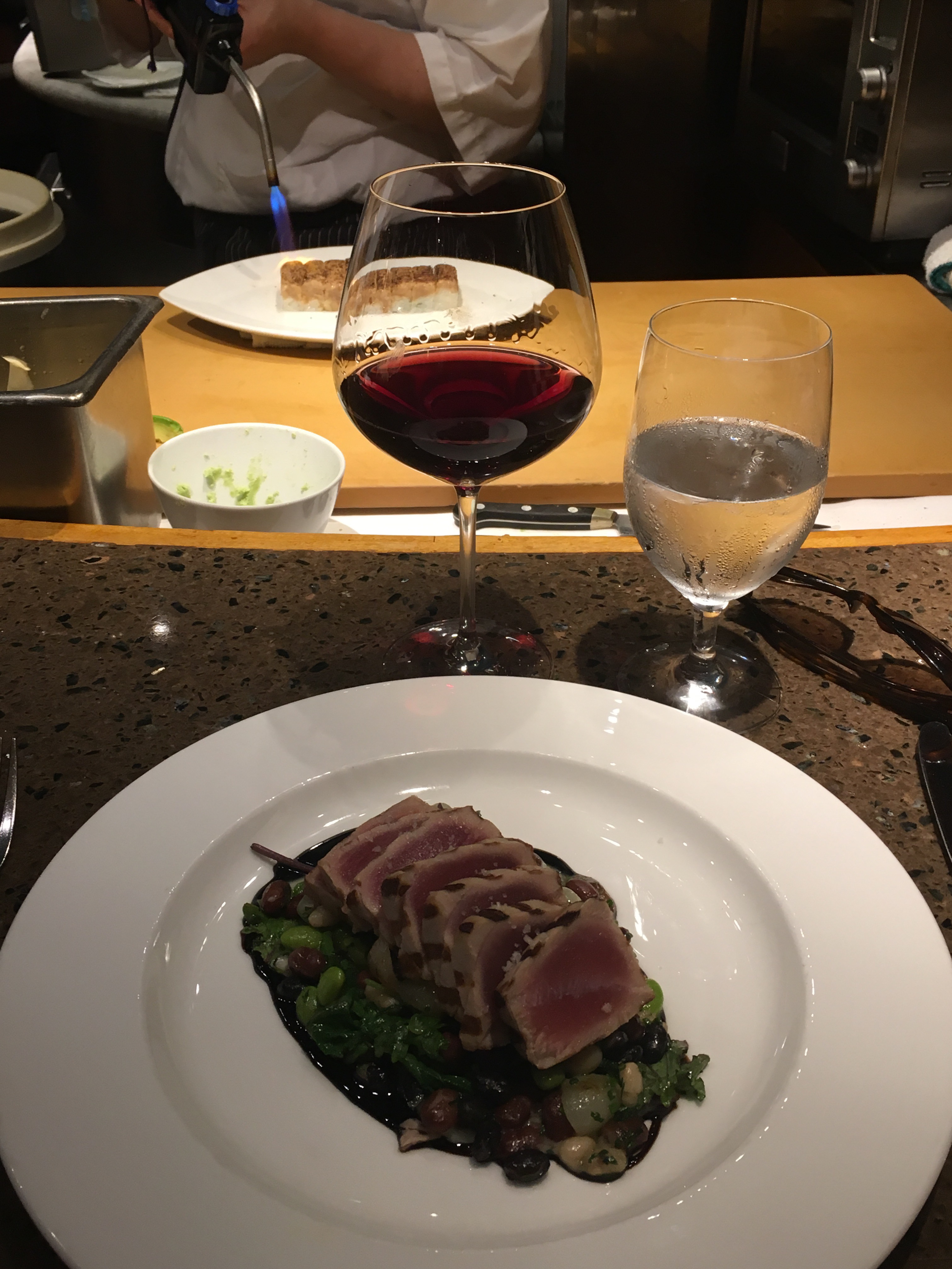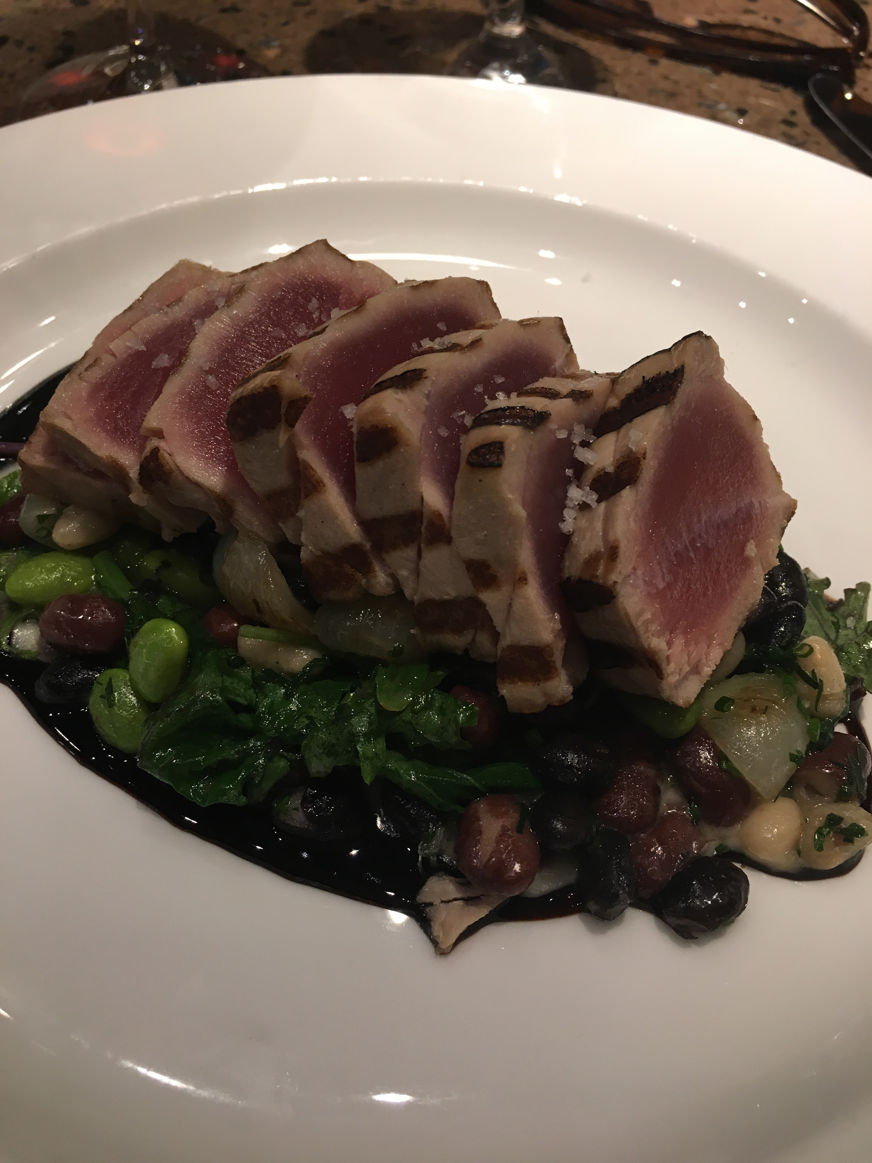 For my main course, I chose a yellowfin tuna seared rare with flecks of sea salt with baby Dino kale, a bean trio of edamame, white and black beans. It was served over a wonderfully Unami sweet onion purée and a tangy soy-balsamic reduction that somewhat resembled Worcestershire sauce with notes of tamarind. It was. A. Ma. Zing. It was the best seared tuna i’ve had since Waterbar. The accompaniments were harmonious and nicely balanced.