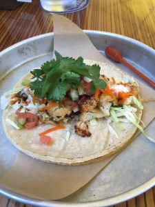 I chose the Dirty Laundry Gewurtztraminer from British Columbia’s primary wine producing region, the Okanagan Valley, paired with a vegetarian, non-dairy cauliflower taco, which was highly recommended on Yelp and Trip Advisor. The taco wasn’t extraordinary, but it was a pleasant sweet-spicy-savory bite and decently priced. The wine had powerful floral notes and a boldness more typical of New World wines as opposed to the delicate aromas of Gewurtztraminers from Alsace, the German-French wine region known for its Gewurtz.