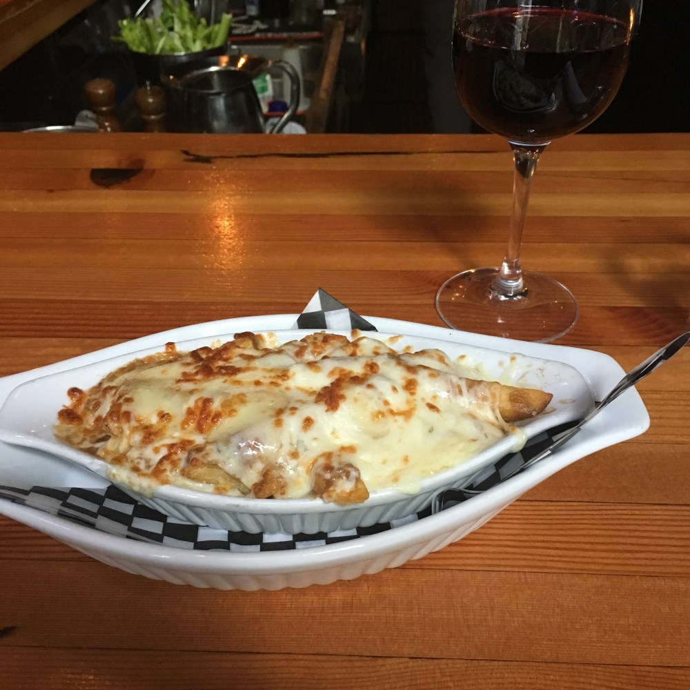 A brief word about poutine for my non-Canadian readers. Poutine is one of Canada’s signature national dishes. It is not for the faint – or literally weak – of heart, as it is your arteries’ worst nightmare. I’ve seen it make inroads in the US in the past 5 years, but many, including my own father, had never heard of it. So allow me to enlighten you, if you’ve not already made a frenemy out of poutine. Poutine consists of French fries/pomme frites smothered in gravy – often poultry gravy; the best comes from duck fat – and then covered with cheese curds. Now, looking at this photograph, at first glance, you might assume it to be lasagna or cannelloni, but The Flying Pig’s poutine is coated with a layer of solid, broiled cheese. While I would have liked to experience cheese curds rather than a cheese layer, it was sinfully delicious, made even better by the wine. I stopped myself at half a portion, as nobody should attempt to eat the entire serving themselves. And it was time to move on once more!