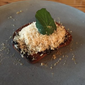 Wildebeest has a short happy hour from 5 to 6 pm with reduced prices on small bites, such as its shaved foie gras, house wines, and cocktails. I went for the house red – which changes regularly; on this day, it was a fantastic Pinot noir from BC’s Okanagan Valley (I sound like the proverbial broken record here). With it, I tried the shaved foie gras snack. And snack it was: a crisp brioche toast (bit like Melba toast), topped with a blueberry compote, the thinnest mandoline-sliced bit of foie gras terrine, and Parmesan cheese. Unfortunately, I could barely taste the umami goodness of the foie gras, instead getting mostly the toast and compote. Oh well!