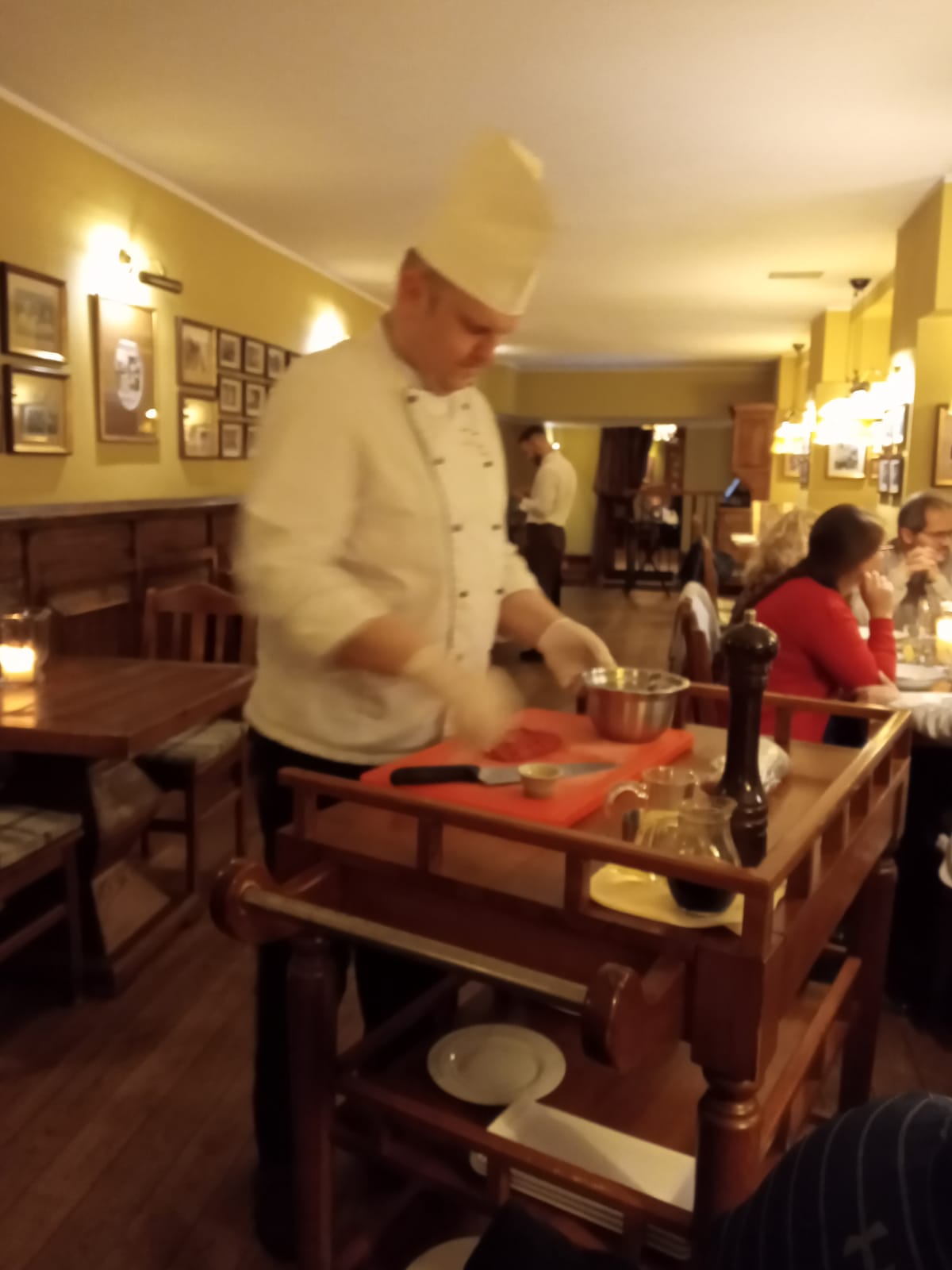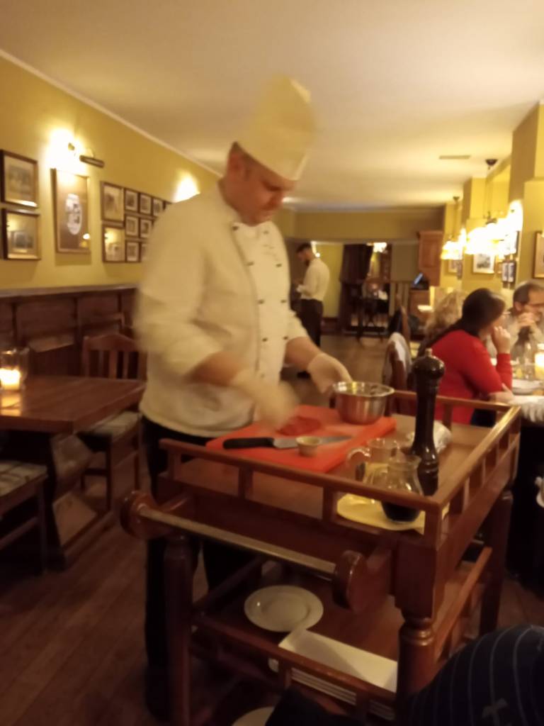 Deciding what to order is a challenge, with such a large menu packed with delectable comfort food. I highly recommend dining as a group and sharing a few appetizers and desserts (if you can dare not to keep one all to yourself!) to fully experience their Polish cuisine. One not to miss appetizer is their Beef Tartare, assembled tableside by a chef. Side note: it’s fascinating to see specific dishes that originated in one location becoming loved regional dishes somewhere else – with their own spin. Central/Eastern Europe seems to really have adopted and adapted beef tartare as a regional specialty, with each country adding its own flare – seasonings, condiments, etc. Fun fact: the true origin of steak/beef tartare (formerly made of horsemeat!) is unknown. Some theorize it originated from the Mongols or Tatars in Central Asia, who supposedly tenderized their meat while carrying it in their saddles; its first known appearance in restaurant culture was actually in the United States – notably in New York, but it found its way into French cookbooks and European cafes in the 20s and later, after World War II. Anyhow, beef tartare takes on its own incarnation in eastern Europe, often swapping dill pickles for capers and adding spicy, whole grain brown mustard to the traditional diced onions and egg yolk. Stary Dom’s is as good as its reputation – but I think we collectively wished we’d ordered multiples of it – which, we later reneged on, since our other appetizers, entrees, and deserts washed away the pang of disappointment of wolfing down the tartare.